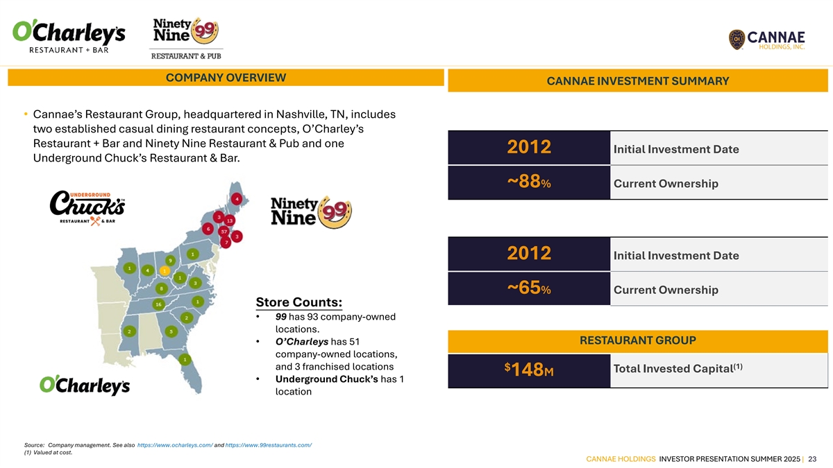COMPANY OVERVIEW CANNAE INVESTMENT SUMMARY • Cannae’s Restaurant Group, headquartered in Nashville, TN, includes two established casual dining restaurant concepts, O’Charley’s Restaurant + Bar and Ninety Nine Restaurant & Pub and one 2012 Initial Investment Date Underground Chuck’s Restaurant & Bar. ~88% Current Ownership 2012 Initial Investment Date ~65% Current Ownership Store Counts: • 99 has 93 company-owned locations. RESTAURANT GROUP • O’Charleys has 51 company-owned locations, (1) and 3 franchised locations $ Total Invested Capital 148M • Underground Chuck’s has 1 location Source: Company management. See also https://www.ocharleys.com/ and https://www.99restaurants.com/ (1) Valued at cost. CANNAE HOLDINGS INVESTOR PRESENTATION SUMMER 2025 | 23