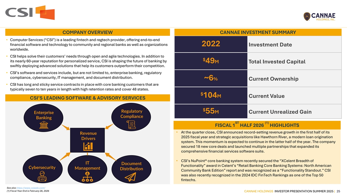 COMPANY OVERVIEW CANNAE INVESTMENT SUMMARY • Computer Services (“CSI”) is a leading fintech and regtech provider, offering end-to-end financial software and technology to community and regional banks as well as organizations 2022 Investment Date worldwide. • CSI helps solve their customers’ needs through open and agile technologies. In addition to $ its nearly 60-year reputation for personalized service, CSI is shaping the future of banking by 49M Total Invested Capital swiftly deploying advanced solutions that help its customers outperform their competition. • CSI’s software and services include, but are not limited to, enterprise banking, regulatory compliance, cybersecurity, IT management, and document distribution. ~6% Current Ownership • CSI has long and sticky service contracts in place with core banking customers that are typically seven to ten years in length with high retention rates and cover 48 states. $ 104M Current Value CSI’S LEADING SOFTWARE & ADVISORY SERVICES $ Regulatory 55M Current Unrealized Gain Enterprise Compliance Banking ST (1) FISCAL 1 HALF 2026 HIGHLIGHTS • At the quarter close, CSI announced record-setting revenue growth in the first half of its Revenue 2025 fiscal year and strategic acquisitions like Hawthorn River, a modern loan origination Drivers system. This momentum is expected to continue in the latter half of the year. The company secured 18 new core deals and launched multiple partnerships that expanded its comprehensive financial services software suite. • CSI’s NuPoint® core banking system recently secured the “XCelent Breadth of IT Document Functionality” award in Celent’s “Retail Banking Core Banking Systems: North American Cybersecurity Management Distribution Community Bank Edition” report and was recognized as a “Functionality Standout.” CSI was also recently recognized in the 2024 IDC FinTech Rankings as one of the Top 50 fintechs. See also https://www.csiweb.com/ (1) Fiscal Year End is February 28, 2026 CANNAE HOLDINGS INVESTOR PRESENTATION SUMMER 2025 | 25