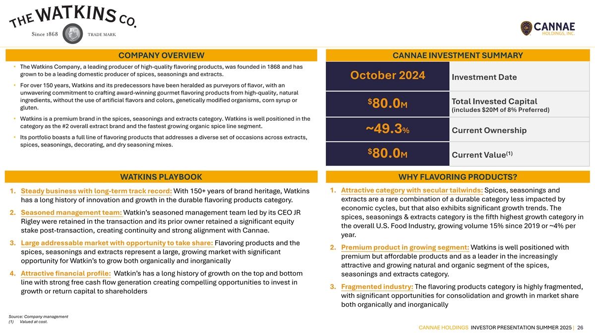 COMPANY OVERVIEW CANNAE INVESTMENT SUMMARY • The Watkins Company, a leading producer of high-quality flavoring products, was founded in 1868 and has grown to be a leading domestic producer of spices, seasonings and extracts. October 2024 Investment Date • For over 150 years, Watkins and its predecessors have been heralded as purveyors of flavor, with an unwavering commitment to crafting award-winning gourmet flavoring products from high-quality, natural ingredients, without the use of artificial flavors and colors, genetically modified organisms, corn syrup or $ Total Invested Capital 80.0M gluten. (includes $20M of 8% Preferred) • Watkins is a premium brand in the spices, seasonings and extracts category. Watkins is well positioned in the category as the #2 overall extract brand and the fastest growing organic spice line segment. ~49.3% Current Ownership • Its portfolio boasts a full line of flavoring products that addresses a diverse set of occasions across extracts, spices, seasonings, decorating, and dry seasoning mixes. $ (1) 80.0M Current Value WATKINS PLAYBOOK WHY FLAVORING PRODUCTS? 1. Attractive category with secular tailwinds: Spices, seasonings and 1. Steady business with long-term track record: With 150+ years of brand heritage, Watkins extracts are a rare combination of a durable category less impacted by has a long history of innovation and growth in the durable flavoring products category. economic cycles, but that also exhibits significant growth trends. The 2. Seasoned management team: Watkin’s seasoned management team led by its CEO JR spices, seasonings & extracts category is the fifth highest growth category in Rigley were retained in the transaction and its prior owner retained a significant equity the overall U.S. Food Industry, growing volume 15% since 2019 or ~4% per stake post-transaction, creating continuity and strong alignment with Cannae. year. 3. Large addressable market with opportunity to take share: Flavoring products and the 2. Premium product in growing segment: Watkins is well positioned with spices, seasonings and extracts represent a large, growing market with significant premium but affordable products and as a leader in the increasingly opportunity for Watkin’s to grow both organically and inorganically attractive and growing natural and organic segment of the spices, 4. Attractive financial profile: Watkin’s has a long history of growth on the top and bottom seasonings and extracts category. line with strong free cash flow generation creating compelling opportunities to invest in 3. Fragmented industry: The flavoring products category is highly fragmented, growth or return capital to shareholders with significant opportunities for consolidation and growth in market share both organically and inorganically Source: Company management (1) Valued at cost. CANNAE HOLDINGS INVESTOR PRESENTATION SUMMER 2025 | 26