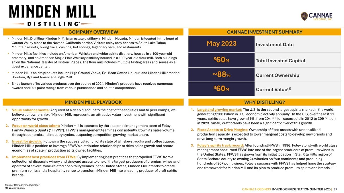 COMPANY OVERVIEW CANNAE INVESTMENT SUMMARY • Minden Mill Distilling (Minden Mill), is an estate distillery in Minden, Nevada. Minden is located in the heart of Carson Valley close to the Nevada-California border. Visitors enjoy easy access to South Lake Tahoe May 2023 Investment Date Mountain resorts, hiking trails, casinos, hot springs, legendary bars, and restaurants. • Minden Mill's facilities include an American Whiskey and white spirits distillery, housed in a 100-year-old creamery, and an American Single Malt Whiskey distillery housed in a 100-year-old flour mill. Both buildings $ 60M Total Invested Capital sit on the National Register of Historic Places. The flour mill includes multiple tasting areas and serves as a guest experience center. • Minden Mill’s spirits products include High Ground Vodka, Evil Bean Coffee Liqueur, and Minden Mill branded ~88% Current Ownership Bourbon, Rye and American Single Malt • Since launch of its various products over the course of 2024, Minden’s products have received numerous awards and 90+ point ratings from various publications and spirit’s competitions $ (1) 60M Current Value MINDEN MILL PLAYBOOK WHY DISTILLING? 1. Large and growing market: The U.S. is the second largest spirits market in the world, 1. Value enhancements: Acquired at a deep discount to the cost of the facilities and to peer comps, we generating $200 Billion in U.S. economic activity annually. In the U.S, over the last 11 believe our ownership of Minden Mill, represents an attractive value investment with significant years, spirits sales have grown 51%, from 204 Million cases sold in 2012 to 309 Million opportunity for growth. in 2023. Small, craft brands have been a significant driver of this growth. 2. Focus on world class talent: Minden Mill is operated by the seasoned management team of Foley 2. Fixed Assets to Drive Margins: Ownership of fixed assets with underutilized Family Wines & Spirits (“FFWS”). FFWS’s management team has consistently grown its sales volume production capacity is expected to lower marginal costs to develop new brands and through economic and industry cycles, outpacing competition growing market share. drive long-term margin growth. 3. Invest for growth: Following the successful launch of its slate of whiskeys, vodka and coffee liqueur, 3. Foley’s spirits track record: After founding FFWS in 1996, Foley along with world class Minden Mill is position to leverage FFWS’s distribution relationships to drive sales growth and create management has turned FFWS into one of the largest producers of premium wines in economies of scale in production at its owned facilities. the United States. FFWS has grown from its initial location in Sta. Rita Hills region of 4. Implement best practices from FFWs: By implementing best practices that propelled FFWS from a Santa Barbara county to owning 24 wineries on four continents and producing collection of disparate winery and vineyard assets to one of the largest producers of premium wines and hundreds of 90+ point wines. Foley’s success with FFWS has helped hone the strategy operator of several wine-related hospitality venues in the United States, Minden Mill intends to create and framework for Minden Mill and its plan to produce premium spirits and brands. premium spirits and a hospitality venue to transform Minden Mill into a leading producer of craft spirits brands. Source: Company management (1) Valued at cost. CANNAE HOLDINGS INVESTOR PRESENTATION SUMMER 2025 | 27