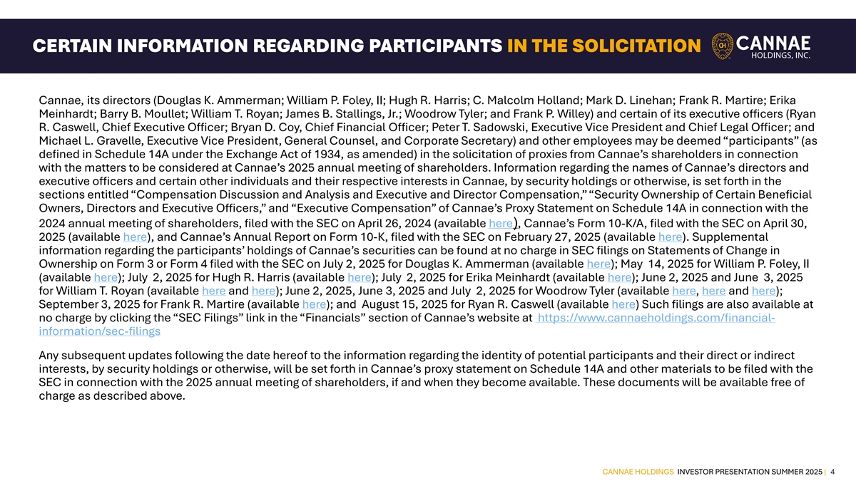 IMPORTANT ADDITIONAL INFORMATION AND WHERE TO FIND IT Cannae intends to file a proxy statement on Schedule 14A, an accompanying WHITE proxy card, and other relevant documents with the SEC in connection with the solicitation of proxies from Cannae’s shareholders for Cannae’s 2025 annual meeting of shareholders. CANNAE’S SHAREHOLDERS ARE STRONGLY ENCOURAGED TO READ CANNAE’S DEFINITIVE PROXY STATEMENT (INCLUDING ANY AMENDMENTS OR SUPPLEMENTS THERETO), THE ACCOMPANYING WHITE PROXY CARD, AND ANY OTHER DOCUMENTS FILED WITH THE SEC CAREFULLY AND IN THEIR ENTIRETY WHEN THEY BECOME AVAILABLE BECAUSE THEY WILL CONTAIN IMPORTANT INFORMATION. Shareholders may obtain a free copy of the definitive proxy statement, an accompanying WHITE proxy card, any amendments or supplements to the proxy statement, and other documents that Cannae files with the SEC at no charge from the SEC’s website at www.sec.gov. Copies will also be available at no charge by clicking the “SEC Filings” link in the “Financials” section of Cannae’s website at https://www.cannaeholdings.com/financial-information/sec-filings. CANNAE HOLDINGS INVESTOR PRESENTATION SUMMER 2025 | 3