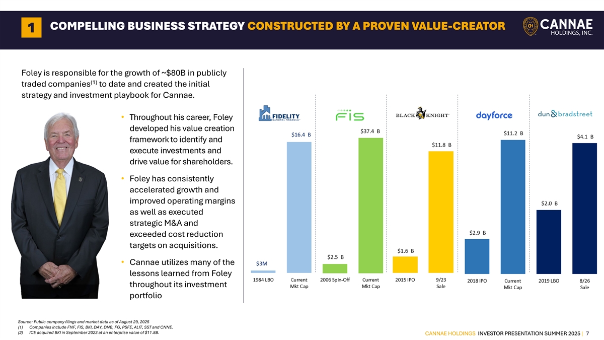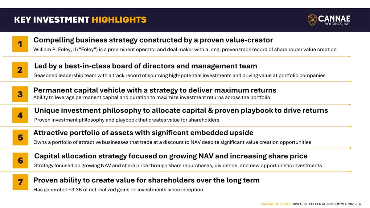 KEY INVESTMENT HIGHLIGHTS Compelling business strategy constructed by a proven value-creator 1 William P. Foley, II (“Foley”) is a preeminent operator and deal maker with a long, proven track record of shareholder value creation Led by a best-in-class board of directors and management team 2 Seasoned leadership team with a track record of sourcing high-potential investments and driving value at portfolio companies Permanent capital vehicle with a strategy to deliver maximum returns 3 Ability to leverage permanent capital and duration to maximize investment returns across the portfolio Unique investment philosophy to allocate capital & proven playbook to drive returns 4 Proven investment philosophy and playbook that creates value for shareholders Attractive portfolio of assets with significant embedded upside 5 Owns a portfolio of attractive businesses that trade at a discount to NAV despite significant value creation opportunities Capital allocation strategy focused on growing NAV and increasing share price 6 Strategy focused on growing NAV and share price through share repurchases, dividends, and new opportunistic investments Proven ability to create value for shareholders over the long term 7 Has generated ~3.3B of net realized gains on investments since inception CANNAE HOLDINGS INVESTOR PRESENTATION SUMMER 2025 | 6