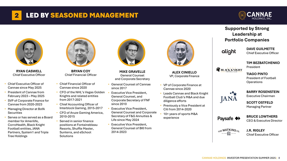 LED BY SEASONED MANAGEMENT 2 Supported by Strong Leadership at Portfolio Companies DAVE GUILMETTE Chief Executive Officer TIM BEZBATCHENKO President RYAN CASWELL BRYAN COY MIKE GRAVELLE ALEX CINIELLO TIAGO PINTO Chief Executive Officer Chief Financial Officer General Counsel VP, Corporate Finance President of Football and Corporate Secretary Operations • Chief Executive Officer of • Chief Financial Officer of • General Counsel of Cannae • VP of Corporate Finance at Cannae since May 2025 Cannae since 2020 since 2017 Cannae since 2020 BARRY ROSENSTEIN • President of Cannae from • CFO of the NHL’s Vegas Golden • Executive Vice President, • Leads Cannae and Black Knight Executive Chairman February 2023 – May 2025 Knights and related entities General Counsel, and Football Club’s M&A and due from 2017-2021 Corporate Secretary of FNF • SVP of Corporate Finance for diligence efforts SCOTT OSTFELD since 2010 Cannae from 2020-2023 • Chief Accounting Officer of • Previously a Vice President at Managing Partner Interblock Gaming, 2015-2017 • Executive Vice President, • Managing Director at BofA Citi from 2014-2020 General Counsel and Corporate Securities • CFO of Aruze Gaming America, • 10+ years of sports M&A Secretary of F&G Annuities & 2010-2015 BRUCE LOWTHERS • Serves or has served as a Board experience Life since May 2024 CEO & Executive Director member for Amerilife, • Served in senior finance • Executive Vice President, CorroHealth, Black Knight positions at Fontainebleau General Counsel of BKI from Football entities, JANA Resorts, Shuffle Master, J.R. RIGLEY 2014-2023 Partners, System1 and Triple Sunterra, and eSchool Chief Executive Officer Tree Holdings Solutions CANNAE HOLDINGS INVESTOR PRESENTATION SUMMER 2025 | 8