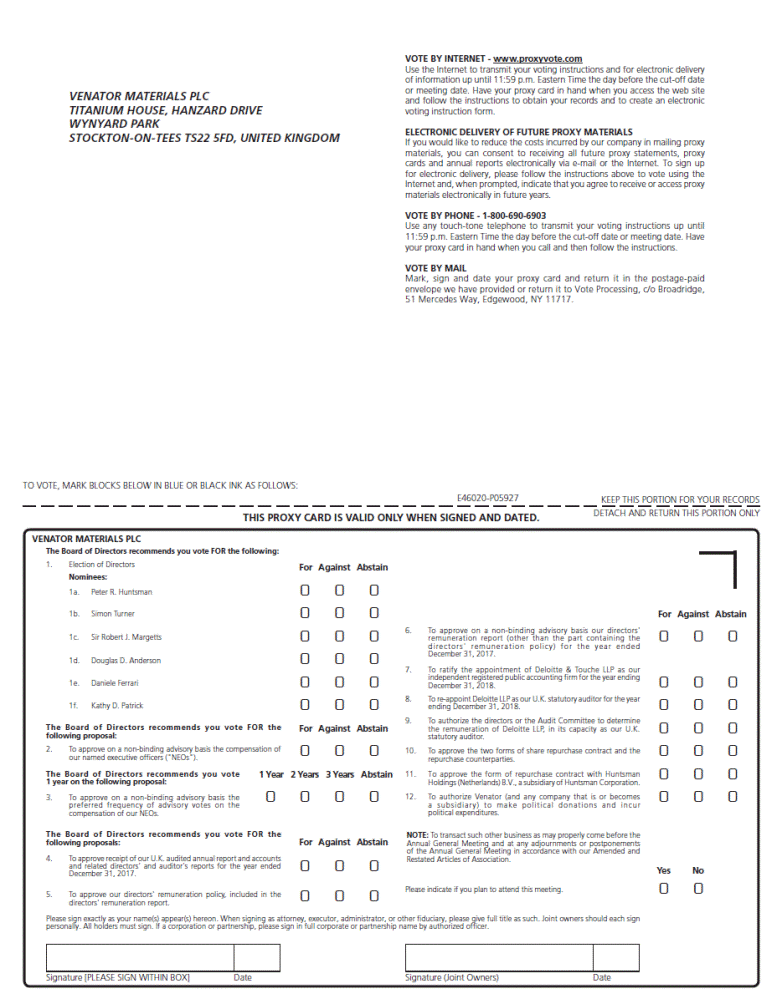 VOTE BY INTERNET - www.proxyvote.com Use the Internet to transmit your voting instructions and for electronic delivery of information up until 11:59 p.m. Eastern Time the day before the cut-off date or meeting date. Have your proxy card in hand when you access the web site and follow the instructions to obtain your records and to create an electronic voting instruction form. VENATOR MATERIALS PLC TITANIUM HOUSE, HANZARD DRIVE WYNYARD PARK STOCKTON-ON-TEES TS22 5FD, UNITED KINGDOM ELECTRONIC DELIVERY OF FUTURE PROXY MATERIALS If you would like to reduce the costs incurred by our company in mailing proxy materials, you can consent to receiving all future proxy statements, proxy cards and annual reports electronically via e-mail or the Internet. To sign up for electronic delivery, please follow the instructions above to vote using the Internet and, when prompted, indicate that you agree to receive or access proxy materials electronically in future years. VOTE BY PHONE - 1-800-690-6903 Use any touch-tone telephone to transmit your voting instructions up until 11:59 p.m. Eastern Time the day before the cut-off date or meeting date. Have your proxy card in hand when you call and then follow the instructions. VOTE BY MAIL Mark, sign and date your proxy card and return it in the postage-paid envelope we have provided or return it to Vote Processing, c/o Broadridge, 51 Mercedes Way, Edgewood, NY 11717. TO VOTE, MARK BLOCKS BELOW IN BLUE OR BLACK INK AS FOLLOWS: E46020-P05927 KEEP THIS PORTION FOR YOUR RECORDS DETACH AND RETURN THIS PORTION ONLY THIS PROXY CARD IS VALID ONLY WHEN SIGNED AND DATED. VENATOR MATERIALS PLC The Board of Directors recommends you vote FOR the following: 1. Election of Directors Nominees: For Against Abstain ! ! ! ! ! ! For ! ! ! ! ! ! Against ! ! ! ! ! ! Abstain 1a. Peter R. Huntsman For Against Abstain 1b. Simon Turner 6. To approve on a non-binding advisory basis our directors' remuneration report (other than the part containing the dir ectors' r emuneration policy) for the year ended December 31, 2017. To ratify the appointment of Deloitte & Touche LLP as our independent registered public accounting firm for the year ending December 31, 2018. To re-appoint Deloitte LLP as our U.K. statutory auditor for the year ending December 31, 2018. To authorize the directors or the Audit Committee to determine the remuneration of Deloitte LLP, in its capacity as our U.K. statutory auditor. To approve the two forms of share repurchase contract and the repurchase counterparties. To approve the form of repurchase contract with Huntsman Holdings (Netherlands) B.V., a subsidiary of Huntsman Corporation. To authorize Venator (and any company that is or becomes a subsidiary) to make political donations and incur political expenditures. ! ! ! 1c. Sir Robert J. Margetts 1d. Douglas D. Anderson 7. ! ! ! ! ! ! ! ! ! ! ! ! ! ! ! ! ! ! 1e. Daniele Ferrari 8. 1f. Kathy D. Patrick 9. The Board of Directors recommends you vote FOR the following proposal: ! 2 Years ! 3 Years ! Abstain 2. To approve on a non-binding advisory basis the compensation of our named executive officers ("NEOs"). 10. The Board of Directors recommends you vote 1 year on the following proposal: 1 Year 11. ! ! ! ! 3. To approve on a non-binding advisory basis the preferred frequency of advisory votes on the compensation of our NEOs. 12. The Board of Directors recommends you vote FOR the following proposals: NOTE: To transact such other business as may properly come before the Annual General Meeting and at any adjournments or postponements of the Annual General Meeting in accordance with our Amended and Restated Articles of Association. For Against Abstain 4. To approve receipt of our U.K. audited annual report and accounts and related directors' and auditor's reports for the year ended December 31, 2017. ! ! ! ! ! ! Yes ! No ! Please indicate if you plan to attend this meeting. 5. To approve our directors' remuneration policy, included in the directors' remuneration report. Please sign exactly as your name(s) appear(s) hereon. When signing as attorney, executor, administrator, or other fiduciary, please give full title as such. Joint owners should each sign personally. All holders must sign. If a corporation or partnership, please sign in full corporate or partnership name by authorized officer. Signature [PLEASE SIGN WITHIN BOX] Date Signature (Joint Owners) Date