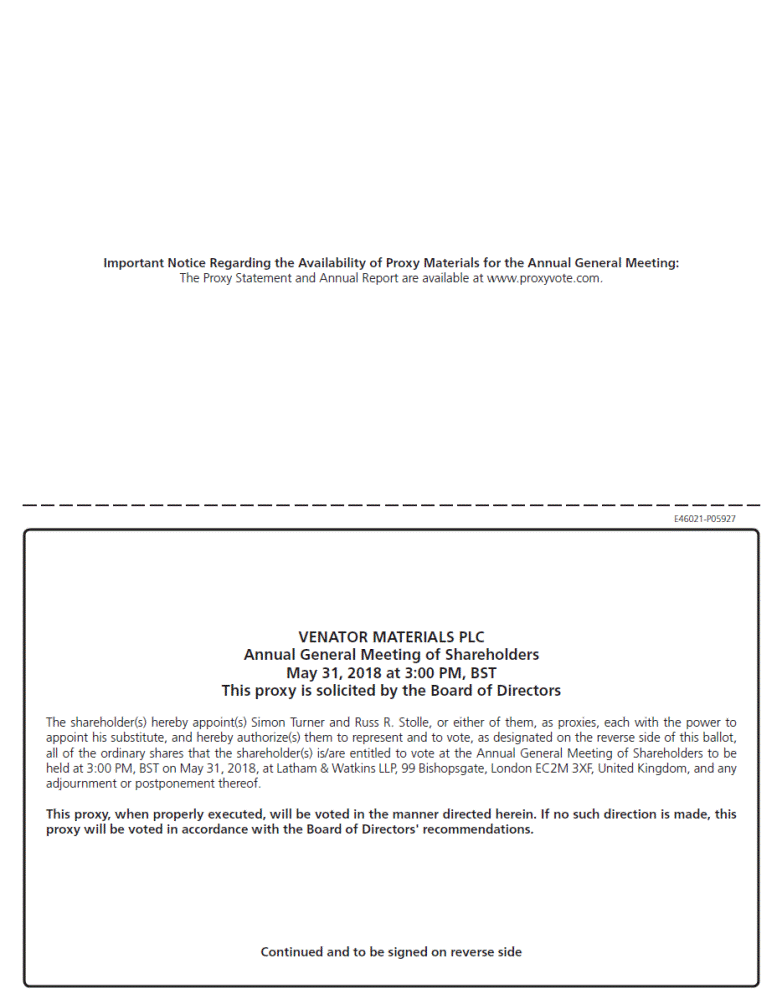 Important Notice Regarding the Availability of Proxy Materials for the Annual General Meeting: The Proxy Statement and Annual Report are available at www.proxyvote.com. E46021-P05927 VENATOR MATERIALS PLC Annual General Meeting of Shareholders May 31, 2018 at 3:00 PM, BST This proxy is solicited by the Board of Directors The shareholder(s) hereby appoint(s) Simon Turner and Russ R. Stolle, or either of them, as proxies, each with the power to appoint his substitute, and hereby authorize(s) them to represent and to vote, as designated on the reverse side of this ballot, all of the ordinary shares that the shareholder(s) is/are entitled to vote at the Annual General Meeting of Shareholders to be held at 3:00 PM, BST on May 31, 2018, at Latham & Watkins LLP, 99 Bishopsgate, London EC2M 3XF, United Kingdom, and any adjournment or postponement thereof. This proxy, when properly executed, will be voted in the manner directed herein. If no such direction is made, this proxy will be voted in accordance with the Board of Directors' recommendations. Continued and to be signed on reverse side