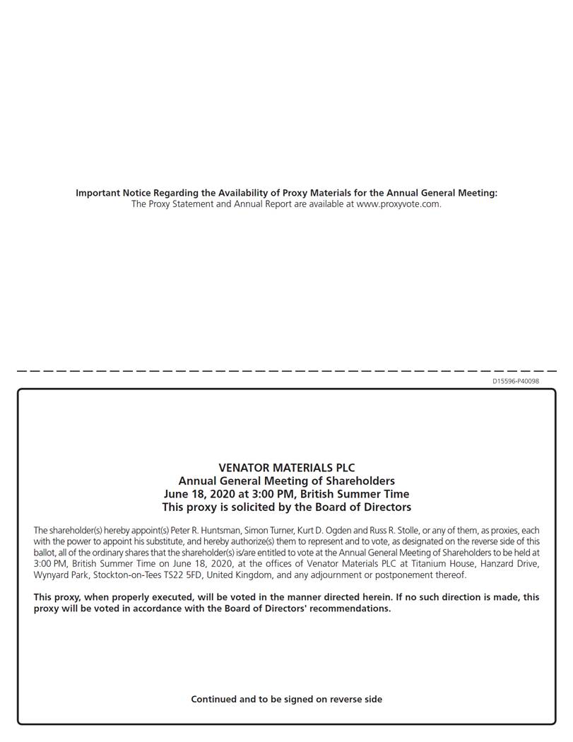 Important Notice Regarding the Availability of Proxy Materials for the Annual General Meeting: The Proxy Statement and Annual Report are available at www.proxyvote.com. D15596-P40098 VENATOR MATERIALS PLC Annual General Meeting of Shareholders June 18, 2020 at 3:00 PM, British Summer Time This proxy is solicited by the Board of Directors The shareholder(s) hereby appoint(s) Peter R. Huntsman, Simon Turner, Kurt D. Ogden and Russ R. Stolle, or either of them, as proxies, each with the power to appoint his substitute, and hereby authorize(s) them to represent and to vote, as designated on the reverse side of this ballot, all of the ordinary shares that the shareholder(s) is/are entitled to vote at the Annual General Meeting of Shareholders to be held at 3:00 PM, British Summer Time on June 18, 2020, at the offices of Venator Materials PLC at Titanium House, Hanzard Drive, Wynyard Park, Stockton-on-Tees TS22 5FD, United Kingdom, and any adjournment or postponement thereof. This proxy, when properly executed, will be voted in the manner directed herein. If no such direction is made, this proxy will be voted in accordance with the Board of Directors' recommendations. Continued and to be signed on reverse side