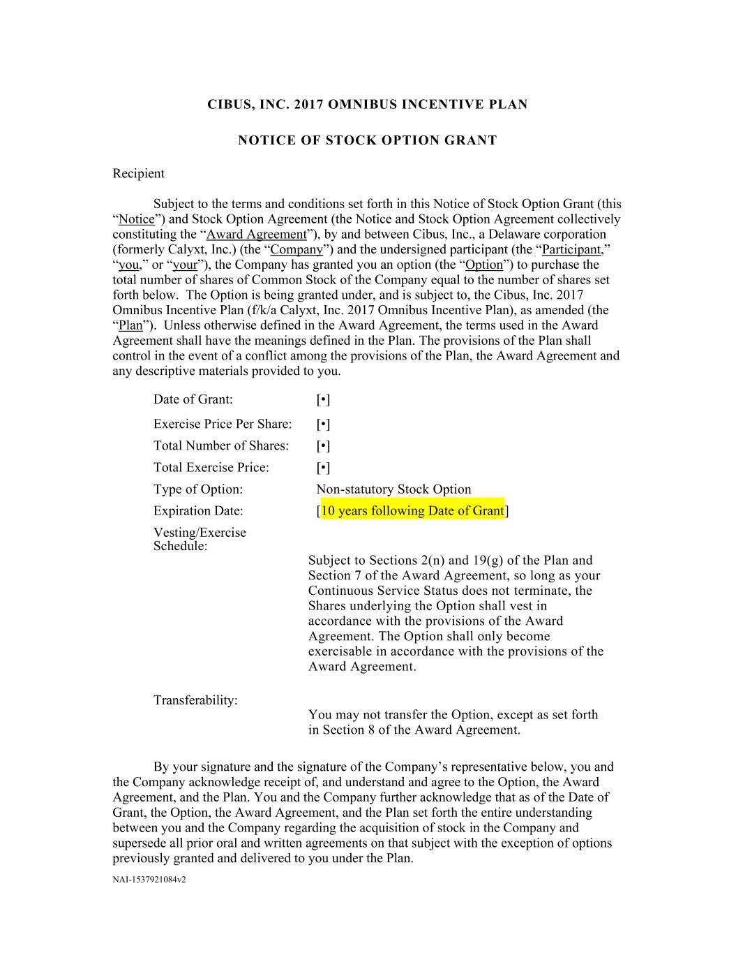 NAI-1537921084v2             CIBUS, INC. 2017 OMNIBUS INCENTIVE PLAN    NOTICE OF STOCK OPTION GRANT    Recipient  Subject to the terms and conditions set forth in this Notice of Stock Option Grant (this  Notice Option Agreement collectively  Award Agreement Company Participant you your Option total number of shares of Common Stock of the Company equal to the number of shares set  forth below.  The Option is being granted under, and is subject to, the Cibus, Inc. 2017  Omnibus Incentive Plan (f/k/a Calyxt, Inc. 2017 Omnibus Incentive Plan), as amended (the  Plan Unless otherwise defined in the Award Agreement, the terms used in the Award  Agreement shall have the meanings defined in the Plan. The provisions of the Plan shall  control in the event of a conflict among the provisions of the Plan, the Award Agreement and  any descriptive materials provided to you.  Date of Grant:    Exercise Price Per Share:    Total Number of Shares:    Total Exercise Price:    Type of Option:  Non-statutory Stock Option  Expiration Date:  [10 years following Date of Grant]  Vesting/Exercise  Schedule:  Subject to Sections 2(n) and 19(g) of the Plan and  Section 7 of the Award Agreement, so long as your  Continuous Service Status does not terminate, the  Shares underlying the Option shall vest in  accordance with the provisions of the Award  Agreement. The Option shall only become  exercisable in accordance with the provisions of the  Award Agreement.    Transferability:  You may not transfer the Option, except as set forth  in Section 8 of the Award Agreement.    the Company acknowledge receipt of, and understand and agree to the Option, the Award  Agreement, and the Plan. You and the Company further acknowledge that as of the Date of  Grant, the Option, the Award Agreement, and the Plan set forth the entire understanding  between you and the Company regarding the acquisition of stock in the Company and  supersede all prior oral and written agreements on that subject with the exception of options  previously granted and delivered to you under the Plan.