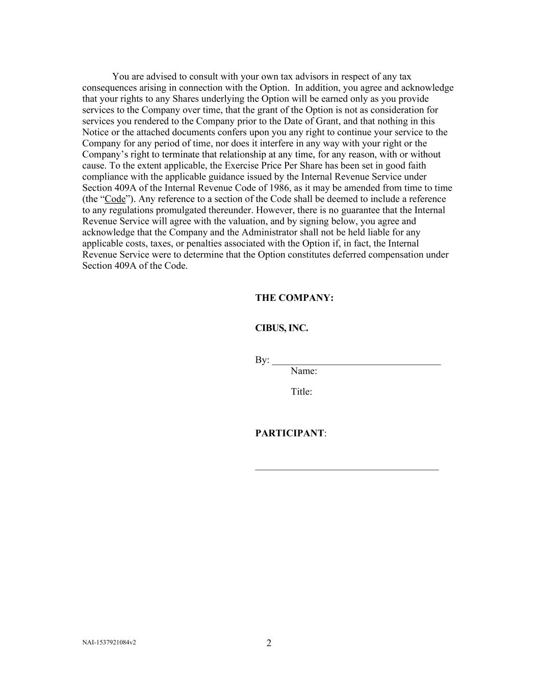 NAI-1537921084v2 2           You are advised to consult with your own tax advisors in respect of any tax  consequences arising in connection with the Option.  In addition, you agree and acknowledge  that your rights to any Shares underlying the Option will be earned only as you provide  services to the Company over time, that the grant of the Option is not as consideration for  services you rendered to the Company prior to the Date of Grant, and that nothing in this  Notice or the attached documents confers upon you any right to continue your service to the  Company for any period of time, nor does it interfere in any way with your right or the  cause. To the extent applicable, the Exercise Price Per Share has been set in good faith  compliance with the applicable guidance issued by the Internal Revenue Service under  Section 409A of the Internal Revenue Code of 1986, as it may be amended from time to time  Code de shall be deemed to include a reference  to any regulations promulgated thereunder. However, there is no guarantee that the Internal  Revenue Service will agree with the valuation, and by signing below, you agree and  acknowledge that the Company and the Administrator shall not be held liable for any  applicable costs, taxes, or penalties associated with the Option if, in fact, the Internal  Revenue Service were to determine that the Option constitutes deferred compensation under  Section 409A of the Code.      THE COMPANY:    CIBUS, INC.    By: __________________________________  Name:    Title:      PARTICIPANT:     _____________________________________