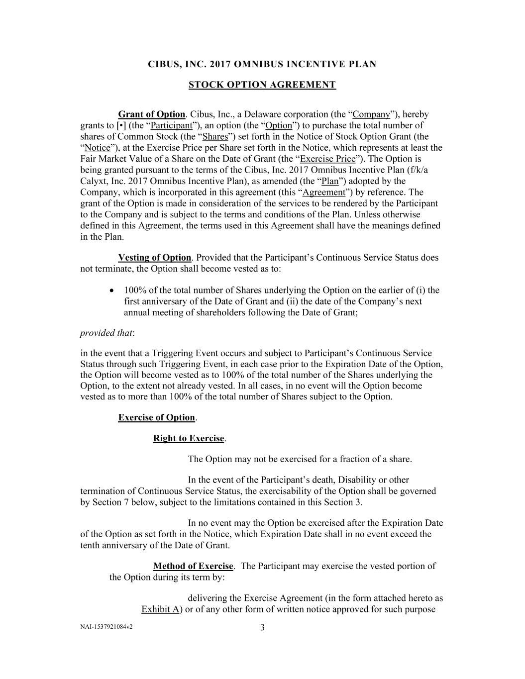 NAI-1537921084v2 3       CIBUS, INC. 2017 OMNIBUS INCENTIVE PLAN  STOCK OPTION AGREEMENT    Grant of Option. Cibus, Inc., a Delaware Company Participant Option Shares Notice Exercise Price being granted pursuant to the terms of the Cibus, Inc. 2017 Omnibus Incentive Plan (f/k/a  Calyxt, Inc. 2017 Omnibus Incentive Plan), as amended Plan Agreement The  grant of the Option is made in consideration of the services to be rendered by the Participant  to the Company and is subject to the terms and conditions of the Plan. Unless otherwise  defined in this Agreement, the terms used in this Agreement shall have the meanings defined  in the Plan.  Vesting of Option.  not terminate, the Option shall become vested as to:    100% of the total number of Shares underlying the Option on the earlier of (i) the  annual meeting of shareholders following the Date of Grant;  provided that:  Status through such Triggering Event, in each case prior to the Expiration Date of the Option,  the Option will become vested as to 100% of the total number of the Shares underlying the  Option, to the extent not already vested. In all cases, in no event will the Option become  vested as to more than 100% of the total number of Shares subject to the Option.  Exercise of Option.  Right to Exercise.  The Option may not be exercised for a fraction of a share.  termination of Continuous Service Status, the exercisability of the Option shall be governed  by Section 7 below, subject to the limitations contained in this Section 3.  In no event may the Option be exercised after the Expiration Date  of the Option as set forth in the Notice, which Expiration Date shall in no event exceed the  tenth anniversary of the Date of Grant.  Method of Exercise.  The Participant may exercise the vested portion of  the Option during its term by:  delivering the Exercise Agreement (in the form attached hereto as  Exhibit A) or of any other form of written notice approved for such purpose