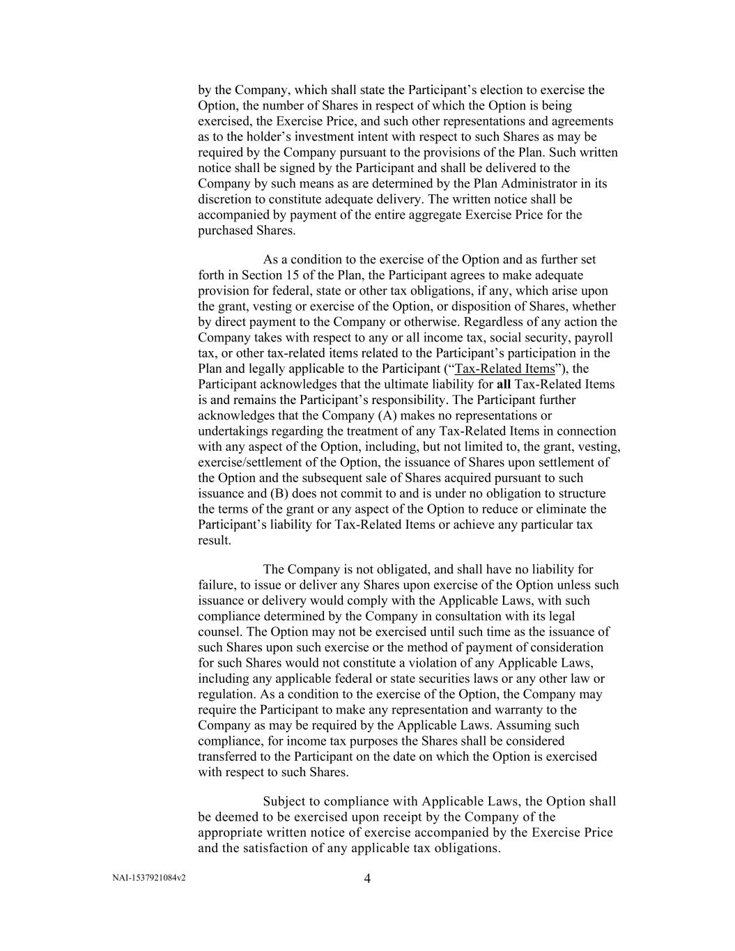 NAI-1537921084v2 4       Option, the number of Shares in respect of which the Option is being  exercised, the Exercise Price, and such other representations and agreements  ent with respect to such Shares as may be  required by the Company pursuant to the provisions of the Plan. Such written  notice shall be signed by the Participant and shall be delivered to the  Company by such means as are determined by the Plan Administrator in its  discretion to constitute adequate delivery. The written notice shall be  accompanied by payment of the entire aggregate Exercise Price for the  purchased Shares.  As a condition to the exercise of the Option and as further set  forth in Section 15 of the Plan, the Participant agrees to make adequate  provision for federal, state or other tax obligations, if any, which arise upon  the grant, vesting or exercise of the Option, or disposition of Shares, whether  by direct payment to the Company or otherwise. Regardless of any action the  Company takes with respect to any or all income tax, social security, payroll  tax, or other tax- participation in the  Tax-Related Items Participant acknowledges that the ultimate liability for all Tax-Related Items  acknowledges that the Company (A) makes no representations or  undertakings regarding the treatment of any Tax-Related Items in connection  with any aspect of the Option, including, but not limited to, the grant, vesting,  exercise/settlement of the Option, the issuance of Shares upon settlement of  the Option and the subsequent sale of Shares acquired pursuant to such  issuance and (B) does not commit to and is under no obligation to structure  the terms of the grant or any aspect of the Option to reduce or eliminate the  -Related Items or achieve any particular tax  result.           The Company is not obligated, and shall have no liability for  failure, to issue or deliver any Shares upon exercise of the Option unless such  issuance or delivery would comply with the Applicable Laws, with such  compliance determined by the Company in consultation with its legal  counsel. The Option may not be exercised until such time as the issuance of  such Shares upon such exercise or the method of payment of consideration  for such Shares would not constitute a violation of any Applicable Laws,  including any applicable federal or state securities laws or any other law or  regulation. As a condition to the exercise of the Option, the Company may  require the Participant to make any representation and warranty to the  Company as may be required by the Applicable Laws. Assuming such  compliance, for income tax purposes the Shares shall be considered  transferred to the Participant on the date on which the Option is exercised  with respect to such Shares.  Subject to compliance with Applicable Laws, the Option shall  be deemed to be exercised upon receipt by the Company of the  appropriate written notice of exercise accompanied by the Exercise Price  and the satisfaction of any applicable tax obligations.