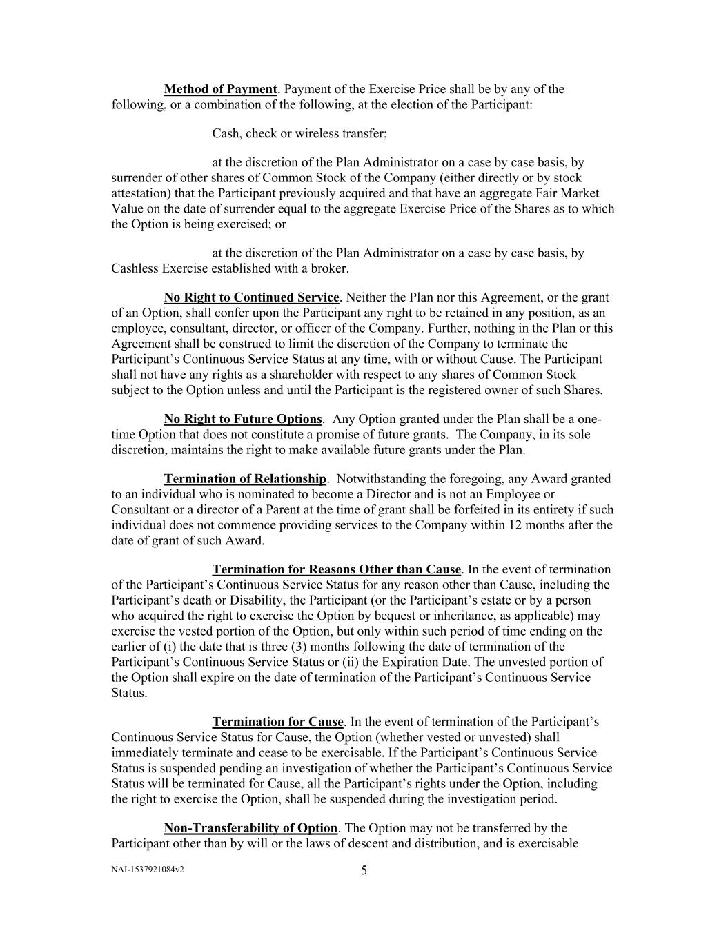 NAI-1537921084v2 5       Method of Payment. Payment of the Exercise Price shall be by any of the  following, or a combination of the following, at the election of the Participant:  Cash, check or wireless transfer;  at the discretion of the Plan Administrator on a case by case basis, by  surrender of other shares of Common Stock of the Company (either directly or by stock  attestation) that the Participant previously acquired and that have an aggregate Fair Market  Value on the date of surrender equal to the aggregate Exercise Price of the Shares as to which  the Option is being exercised; or  at the discretion of the Plan Administrator on a case by case basis, by  Cashless Exercise established with a broker.  No Right to Continued Service. Neither the Plan nor this Agreement, or the grant  of an Option, shall confer upon the Participant any right to be retained in any position, as an  employee, consultant, director, or officer of the Company. Further, nothing in the Plan or this  Agreement shall be construed to limit the discretion of the Company to terminate the  shall not have any rights as a shareholder with respect to any shares of Common Stock  subject to the Option unless and until the Participant is the registered owner of such Shares.  No Right to Future Options.  Any Option granted under the Plan shall be a one- time Option that does not constitute a promise of future grants.  The Company, in its sole  discretion, maintains the right to make available future grants under the Plan.  Termination of Relationship.  Notwithstanding the foregoing, any Award granted  to an individual who is nominated to become a Director and is not an Employee or  Consultant or a director of a Parent at the time of grant shall be forfeited in its entirety if such  individual does not commence providing services to the Company within 12 months after the  date of grant of such Award.    Termination for Reasons Other than Cause. In the event of termination  who acquired the right to exercise the Option by bequest or inheritance, as applicable) may  exercise the vested portion of the Option, but only within such period of time ending on the  earlier of (i) the date that is three (3) months following the date of termination of the  Status.  Termination for Cause.  Continuous Service Status for Cause, the Option (whether vested or unvested) shall  Status is suspended pending an i the right to exercise the Option, shall be suspended during the investigation period.  Non-Transferability of Option. The Option may not be transferred by the  Participant other than by will or the laws of descent and distribution, and is exercisable