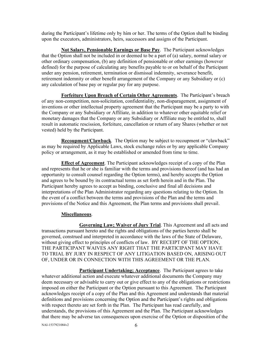 NAI-1537921084v2 6       upon the executors, administrators, heirs, successors and assigns of the Participant.  Not Salary, Pensionable Earnings or Base Pay.  The Participant acknowledges  that the Option shall not be included in or deemed to be a part of (a) salary, normal salary or  other ordinary compensation, (b) any definition of pensionable or other earnings (however  defined) for the purpose of calculating any benefits payable to or on behalf of the Participant  under any pension, retirement, termination or dismissal indemnity, severance benefit,  retirement indemnity or other benefit arrangement of the Company or any Subsidiary or (c)  any calculation of base pay or regular pay for any purpose.  Forfeiture Upon Breach of Certain Other Agreements of any non-competition, non-solicitation, confidentiality, non-disparagement, assignment of  inventions or other intellectual property agreement that the Participant may be a party to with  the Company or any Subsidiary or Affiliate, in addition to whatever other equitable relief or  monetary damages that the Company or any Subsidiary or Affiliate may be entitled to, shall  result in automatic rescission, forfeiture, cancellation or return of any Shares (whether or not  vested) held by the Participant.  Recoupment/Clawback.   as may be required by Applicable Laws, stock exchange rules or by any applicable Company  policy or arrangement, as it may be established or amended from time to time.   Effect of Agreement. The Participant acknowledges receipt of a copy of the Plan  and represents that he or she is familiar with the terms and provisions thereof (and has had an  opportunity to consult counsel regarding the Option terms), and hereby accepts the Option  and agrees to be bound by its contractual terms as set forth herein and in the Plan. The  Participant hereby agrees to accept as binding, conclusive and final all decisions and  interpretations of the Plan Administrator regarding any questions relating to the Option. In  the event of a conflict between the terms and provisions of the Plan and the terms and  provisions of the Notice and this Agreement, the Plan terms and provisions shall prevail.  Miscellaneous.   Governing Law; Waiver of Jury Trial. This Agreement and all acts and  transactions pursuant hereto and the rights and obligations of the parties hereto shall be  governed, construed and interpreted in accordance with the laws of the State of Delaware,  without giving effect to principles of conflicts of law.  BY RECEIPT OF THE OPTION,  THE PARTICIPANT WAIVES ANY RIGHT THAT THE PARTICIPANT MAY HAVE  TO TRIAL BY JURY IN RESPECT OF ANY LITIGATION BASED ON, ARISING OUT  OF, UNDER OR IN CONNECTION WITH THIS AGREEMENT OR THE PLAN.  Participant Undertaking; Acceptance.  The Participant agrees to take  whatever additional action and execute whatever additional documents the Company may  deem necessary or advisable to carry out or give effect to any of the obligations or restrictions  imposed on either the Participant or the Option pursuant to this Agreement.  The Participant  acknowledges receipt of a copy of the Plan and this Agreement and understands that material  ts and obligations  with respect thereto are set forth in the Plan.  The Participant has read carefully, and  understands, the provisions of this Agreement and the Plan. The Participant acknowledges  that there may be adverse tax consequences upon exercise of the Option or disposition of the
