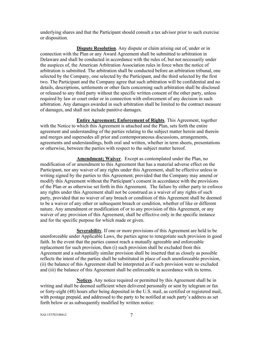 NAI-1537921084v2 7       underlying shares and that the Participant should consult a tax advisor prior to such exercise  or disposition.  Dispute Resolution. Any dispute or claim arising out of, under or in  connection with the Plan or any Award Agreement shall be submitted to arbitration in  Delaware and shall be conducted in accordance with the rules of, but not necessarily under  the auspices of, the American Arbitration Association rules in force when the notice of  arbitration is submitted. The arbitration shall be conducted before an arbitration tribunal, one  selected by the Company, one selected by the Participant, and the third selected by the first  two. The Participant and the Company agree that such arbitration will be confidential and no  details, descriptions, settlements or other facts concerning such arbitration shall be disclosed  or released to any third party without the specific written consent of the other party, unless  required by law or court order or in connection with enforcement of any decision in such  arbitration. Any damages awarded in such arbitration shall be limited to the contract measure  of damages, and shall not include punitive damages.  Entire Agreement; Enforcement of Rights. This Agreement, together  with the Notice to which this Agreement is attached and the Plan, sets forth the entire  agreement and understanding of the parties relating to the subject matter herein and therein  and merges and supersedes all prior and contemporaneous discussions, arrangements,  agreements and understandings, both oral and written, whether in term sheets, presentations  or otherwise, between the parties with respect to the subject matter hereof.   Amendment; Waiver.  Except as contemplated under the Plan, no  modification of or amendment to this Agreement that has a material adverse effect on the  Participant, nor any waiver of any rights under this Agreement, shall be effective unless in  writing signed by the parties to this Agreement; provided that the Company may amend or  of the Plan or as otherwise set forth in this Agreement.  The failure by either party to enforce  any rights under this Agreement shall not be construed as a waiver of any rights of such  party, provided that no waiver of any breach or condition of this Agreement shall be deemed  to be a waiver of any other or subsequent breach or condition, whether of like or different  nature. Any amendment or modification of or to any provision of this Agreement, or any  waiver of any provision of this Agreement, shall be effective only in the specific instance  and for the specific purpose for which made or given.  Severability. If one or more provisions of this Agreement are held to be  unenforceable under Applicable Laws, the parties agree to renegotiate such provision in good  faith. In the event that the parties cannot reach a mutually agreeable and enforceable  replacement for such provision, then (i) such provision shall be excluded from this  Agreement and a substantially similar provision shall be inserted that as closely as possible  reflects the intent of the parties shall be substituted in place of such unenforceable provision,  (ii) the balance of this Agreement shall be interpreted as if such provision were so excluded  and (iii) the balance of this Agreement shall be enforceable in accordance with its terms.  Notices. Any notice required or permitted by this Agreement shall be in  writing and shall be deemed sufficient when delivered personally or sent by telegram or fax  or forty-eight (48) hours after being deposited in the U.S. mail, as certified or registered mail,  w forth below or as subsequently modified by written notice: