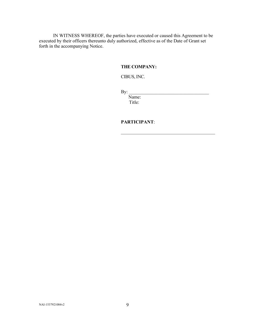 NAI-1537921084v2 9       IN WITNESS WHEREOF, the parties have executed or caused this Agreement to be  executed by their officers thereunto duly authorized, effective as of the Date of Grant set  forth in the accompanying Notice.             THE COMPANY:  CIBUS, INC.    By: __________________________________      Name:         Title:     PARTICIPANT:   ________________________________________
