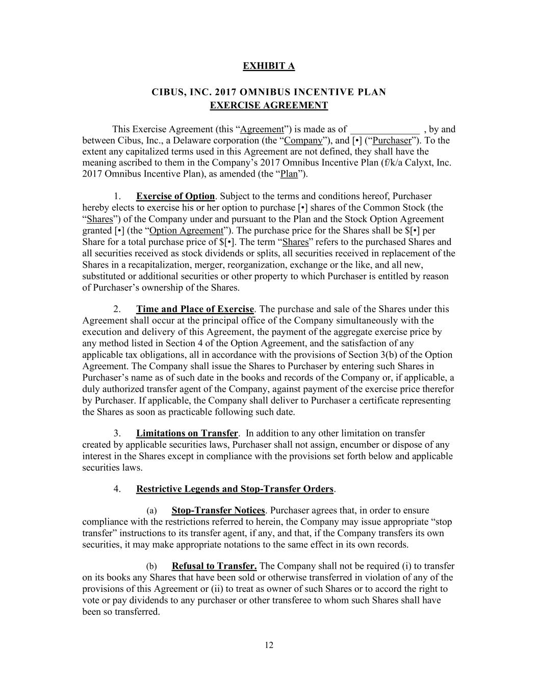 12       EXHIBIT A     CIBUS, INC. 2017 OMNIBUS INCENTIVE PLAN  EXERCISE AGREEMENT  This Exercise Agreement (this “Agreement”) is made as of ______________ , by and  between Cibus, Inc., a Delaware corporation (the “Company”), and [•] (“Purchaser”). To the  extent any capitalized terms used in this Agreement are not defined, they shall have the  meaning ascribed to them in the Company’s 2017 Omnibus Incentive Plan (f/k/a Calyxt, Inc.  2017 Omnibus Incentive Plan), as amended (the “Plan”).    1. Exercise of Option. Subject to the terms and conditions hereof, Purchaser  hereby elects to exercise his or her option to purchase [•] shares of the Common Stock (the  “Shares”) of the Company under and pursuant to the Plan and the Stock Option Agreement  granted [•] (the “Option Agreement”). The purchase price for the Shares shall be $[•] per  Share for a total purchase price of $[•]. The term “Shares” refers to the purchased Shares and  all securities received as stock dividends or splits, all securities received in replacement of the  Shares in a recapitalization, merger, reorganization, exchange or the like, and all new,  substituted or additional securities or other property to which Purchaser is entitled by reason  of Purchaser’s ownership of the Shares.  2. Time and Place of Exercise. The purchase and sale of the Shares under this  Agreement shall occur at the principal office of the Company simultaneously with the  execution and delivery of this Agreement, the payment of the aggregate exercise price by  any method listed in Section 4 of the Option Agreement, and the satisfaction of any  applicable tax obligations, all in accordance with the provisions of Section 3(b) of the Option  Agreement. The Company shall issue the Shares to Purchaser by entering such Shares in  Purchaser’s name as of such date in the books and records of the Company or, if applicable, a  duly authorized transfer agent of the Company, against payment of the exercise price therefor  by Purchaser. If applicable, the Company shall deliver to Purchaser a certificate representing  the Shares as soon as practicable following such date.  3. Limitations on Transfer.  In addition to any other limitation on transfer  created by applicable securities laws, Purchaser shall not assign, encumber or dispose of any  interest in the Shares except in compliance with the provisions set forth below and applicable  securities laws.  4. Restrictive Legends and Stop-Transfer Orders.  (a) Stop-Transfer Notices. Purchaser agrees that, in order to ensure  compliance with the restrictions referred to herein, the Company may issue appropriate “stop  transfer” instructions to its transfer agent, if any, and that, if the Company transfers its own  securities, it may make appropriate notations to the same effect in its own records.  (b) Refusal to Transfer. The Company shall not be required (i) to transfer  on its books any Shares that have been sold or otherwise transferred in violation of any of the  provisions of this Agreement or (ii) to treat as owner of such Shares or to accord the right to  vote or pay dividends to any purchaser or other transferee to whom such Shares shall have  been so transferred.
