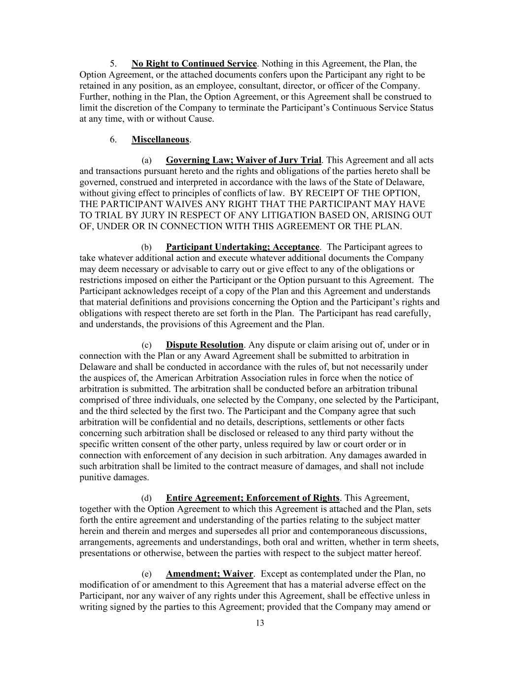13       5. No Right to Continued Service. Nothing in this Agreement, the Plan, the  Option Agreement, or the attached documents confers upon the Participant any right to be  retained in any position, as an employee, consultant, director, or officer of the Company.  Further, nothing in the Plan, the Option Agreement, or this Agreement shall be construed to  limit the discretion of the Company to terminate the Participant’s Continuous Service Status  at any time, with or without Cause.  6. Miscellaneous.   (a) Governing Law; Waiver of Jury Trial. This Agreement and all acts  and transactions pursuant hereto and the rights and obligations of the parties hereto shall be  governed, construed and interpreted in accordance with the laws of the State of Delaware,  without giving effect to principles of conflicts of law.  BY RECEIPT OF THE OPTION,  THE PARTICIPANT WAIVES ANY RIGHT THAT THE PARTICIPANT MAY HAVE  TO TRIAL BY JURY IN RESPECT OF ANY LITIGATION BASED ON, ARISING OUT  OF, UNDER OR IN CONNECTION WITH THIS AGREEMENT OR THE PLAN.  (b) Participant Undertaking; Acceptance.  The Participant agrees to  take whatever additional action and execute whatever additional documents the Company  may deem necessary or advisable to carry out or give effect to any of the obligations or  restrictions imposed on either the Participant or the Option pursuant to this Agreement.  The  Participant acknowledges receipt of a copy of the Plan and this Agreement and understands  that material definitions and provisions concerning the Option and the Participant’s rights and  obligations with respect thereto are set forth in the Plan.  The Participant has read carefully,  and understands, the provisions of this Agreement and the Plan.  (c) Dispute Resolution. Any dispute or claim arising out of, under or in  connection with the Plan or any Award Agreement shall be submitted to arbitration in  Delaware and shall be conducted in accordance with the rules of, but not necessarily under  the auspices of, the American Arbitration Association rules in force when the notice of  arbitration is submitted. The arbitration shall be conducted before an arbitration tribunal  comprised of three individuals, one selected by the Company, one selected by the Participant,  and the third selected by the first two. The Participant and the Company agree that such  arbitration will be confidential and no details, descriptions, settlements or other facts  concerning such arbitration shall be disclosed or released to any third party without the  specific written consent of the other party, unless required by law or court order or in  connection with enforcement of any decision in such arbitration. Any damages awarded in  such arbitration shall be limited to the contract measure of damages, and shall not include  punitive damages.  (d) Entire Agreement; Enforcement of Rights. This Agreement,  together with the Option Agreement to which this Agreement is attached and the Plan, sets  forth the entire agreement and understanding of the parties relating to the subject matter  herein and therein and merges and supersedes all prior and contemporaneous discussions,  arrangements, agreements and understandings, both oral and written, whether in term sheets,  presentations or otherwise, between the parties with respect to the subject matter hereof.   (e) Amendment; Waiver.  Except as contemplated under the Plan, no  modification of or amendment to this Agreement that has a material adverse effect on the  Participant, nor any waiver of any rights under this Agreement, shall be effective unless in  writing signed by the parties to this Agreement; provided that the Company may amend or