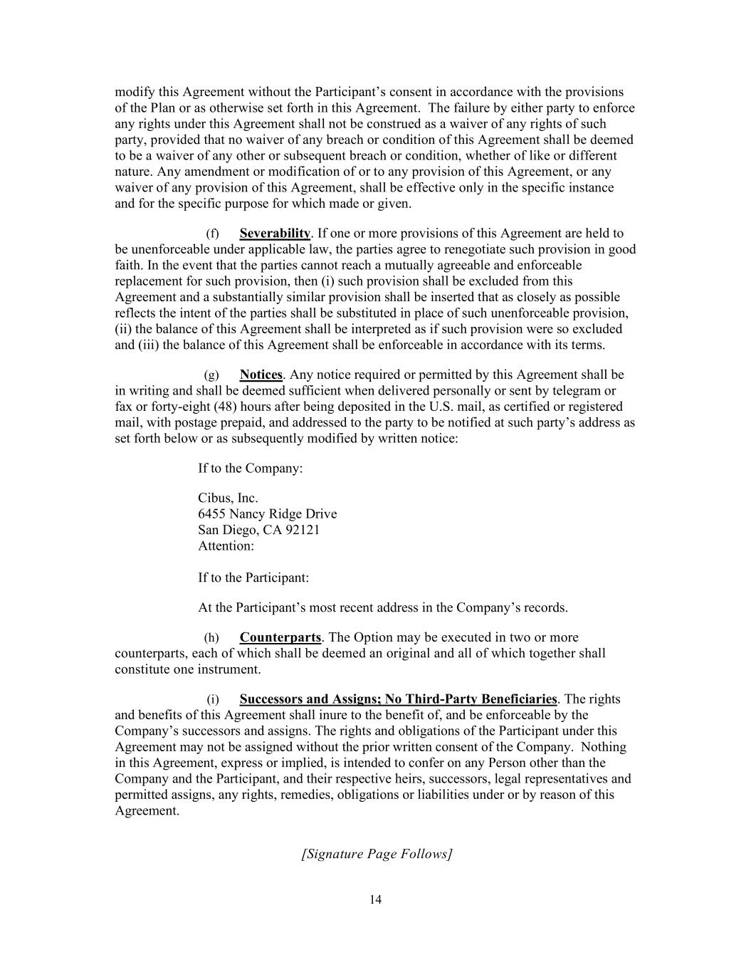 14       modify this Agreement without the Participant’s consent in accordance with the provisions  of the Plan or as otherwise set forth in this Agreement.  The failure by either party to enforce  any rights under this Agreement shall not be construed as a waiver of any rights of such  party, provided that no waiver of any breach or condition of this Agreement shall be deemed  to be a waiver of any other or subsequent breach or condition, whether of like or different  nature. Any amendment or modification of or to any provision of this Agreement, or any  waiver of any provision of this Agreement, shall be effective only in the specific instance  and for the specific purpose for which made or given.  (f) Severability. If one or more provisions of this Agreement are held to  be unenforceable under applicable law, the parties agree to renegotiate such provision in good  faith. In the event that the parties cannot reach a mutually agreeable and enforceable  replacement for such provision, then (i) such provision shall be excluded from this  Agreement and a substantially similar provision shall be inserted that as closely as possible  reflects the intent of the parties shall be substituted in place of such unenforceable provision,  (ii) the balance of this Agreement shall be interpreted as if such provision were so excluded  and (iii) the balance of this Agreement shall be enforceable in accordance with its terms.  (g) Notices. Any notice required or permitted by this Agreement shall be  in writing and shall be deemed sufficient when delivered personally or sent by telegram or  fax or forty-eight (48) hours after being deposited in the U.S. mail, as certified or registered  mail, with postage prepaid, and addressed to the party to be notified at such party’s address as  set forth below or as subsequently modified by written notice:  If to the Company:  Cibus, Inc.  6455 Nancy Ridge Drive  San Diego, CA 92121  Attention:    If to the Participant:  At the Participant’s most recent address in the Company’s records.  (h) Counterparts. The Option may be executed in two or more  counterparts, each of which shall be deemed an original and all of which together shall  constitute one instrument.  (i) Successors and Assigns; No Third-Party Beneficiaries. The rights  and benefits of this Agreement shall inure to the benefit of, and be enforceable by the  Company’s successors and assigns. The rights and obligations of the Participant under this  Agreement may not be assigned without the prior written consent of the Company.  Nothing  in this Agreement, express or implied, is intended to confer on any Person other than the  Company and the Participant, and their respective heirs, successors, legal representatives and  permitted assigns, any rights, remedies, obligations or liabilities under or by reason of this  Agreement.     [Signature Page Follows]