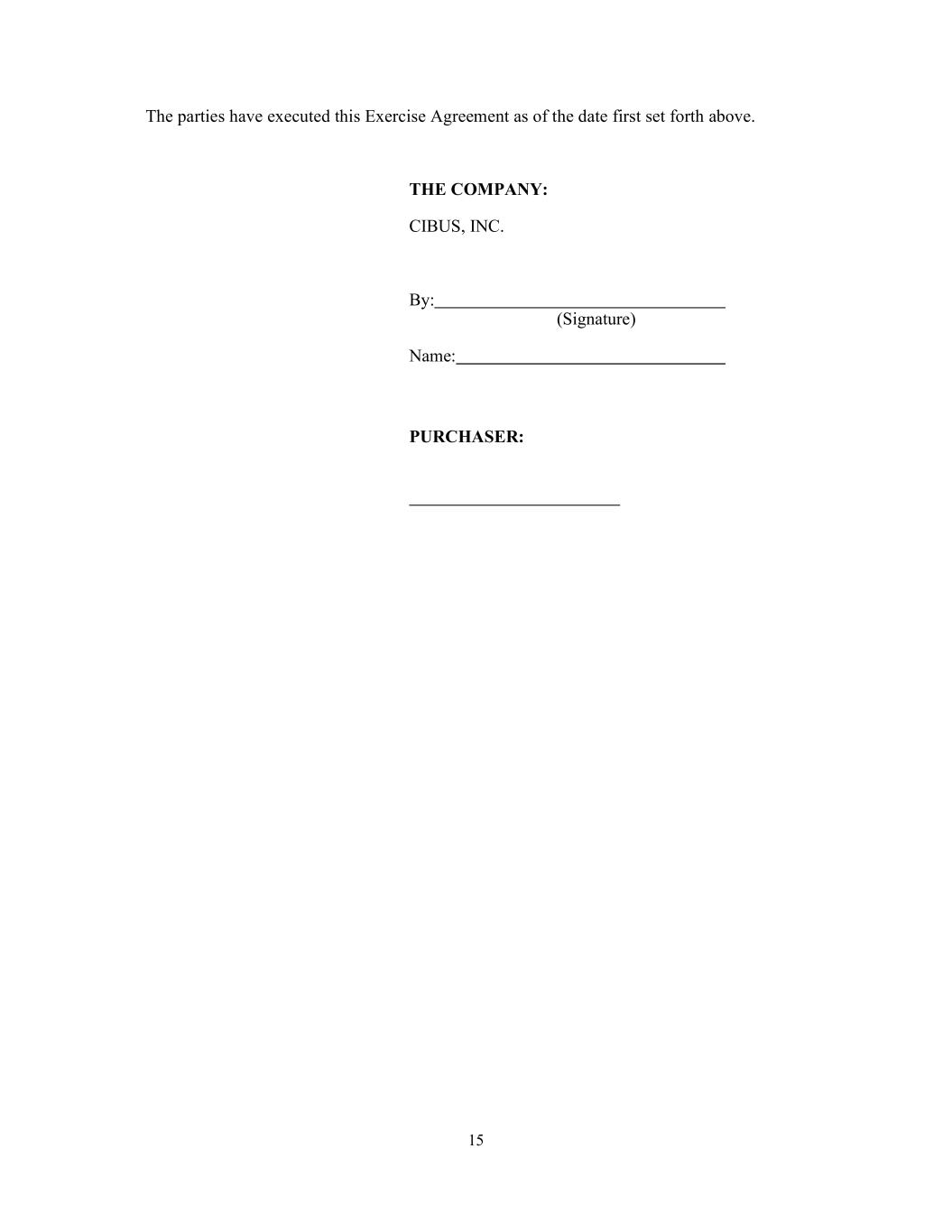 15       The parties have executed this Exercise Agreement as of the date first set forth above.    THE COMPANY:  CIBUS, INC.    By:        (Signature)  Name:                     PURCHASER: