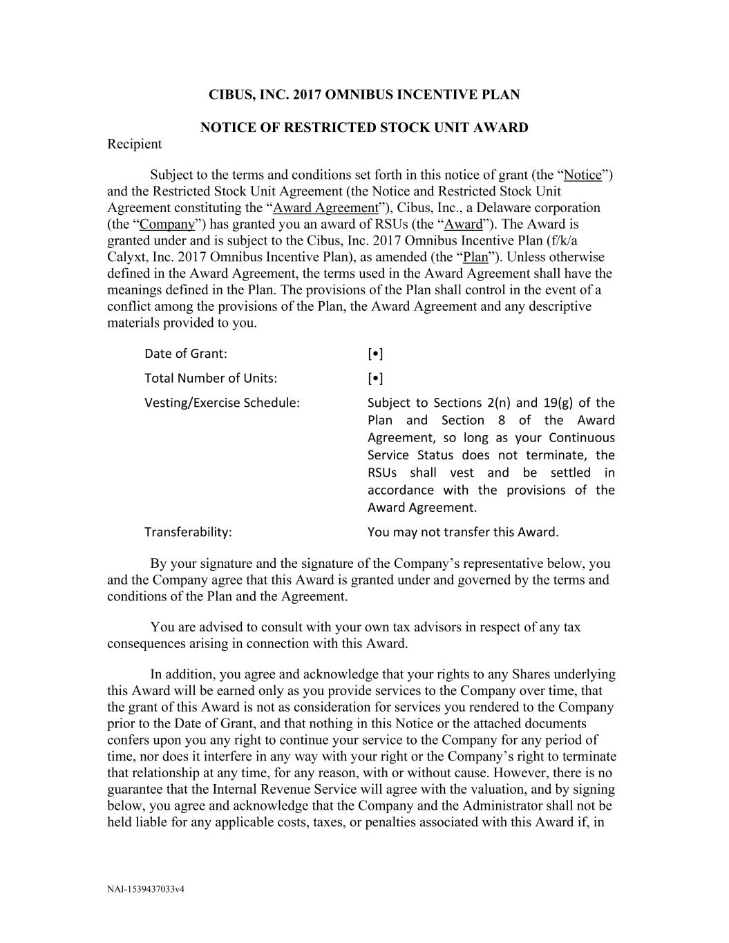 NAI-1539437033v4    CIBUS, INC. 2017 OMNIBUS INCENTIVE PLAN     NOTICE OF RESTRICTED STOCK UNIT AWARD  Recipient   Notice and the Restricted Stock Unit Agreement (the Notice and Restricted Stock Unit  Award Agreement Company Award granted under and is subject to the Cibus, Inc. 2017 Omnibus Incentive Plan (f/k/a  Plan defined in the Award Agreement, the terms used in the Award Agreement shall have the  meanings defined in the Plan. The provisions of the Plan shall control in the event of a  conflict among the provisions of the Plan, the Award Agreement and any descriptive  materials provided to you.  Date of Grant:   Total Number of Units:   Vesting/Exercise Schedule: Subject to Sections 2(n) and 19(g) of the  Plan and Section 8 of the Award  Agreement, so long as your Continuous  Service Status does not terminate, the  RSUs shall vest and be settled in  accordance with the provisions of the  Award Agreement.  Transferability: You may not transfer this Award.  By your  and the Company agree that this Award is granted under and governed by the terms and  conditions of the Plan and the Agreement.  You are advised to consult with your own tax advisors in respect of any tax  consequences arising in connection with this Award.  In addition, you agree and acknowledge that your rights to any Shares underlying  this Award will be earned only as you provide services to the Company over time, that  the grant of this Award is not as consideration for services you rendered to the Company  prior to the Date of Grant, and that nothing in this Notice or the attached documents  confers upon you any right to continue your service to the Company for any period of  inate  that relationship at any time, for any reason, with or without cause. However, there is no  guarantee that the Internal Revenue Service will agree with the valuation, and by signing  below, you agree and acknowledge that the Company and the Administrator shall not be  held liable for any applicable costs, taxes, or penalties associated with this Award if, in