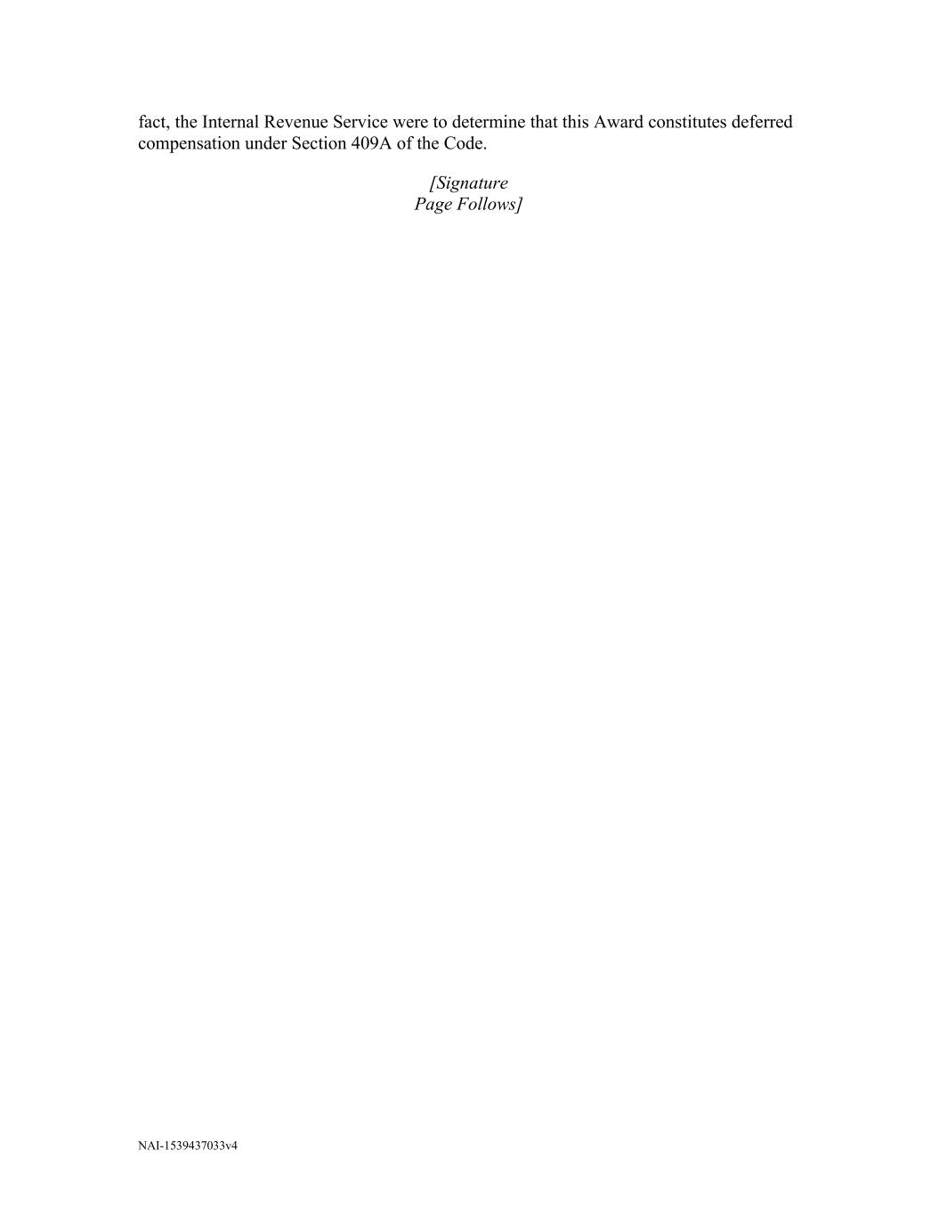 NAI-1539437033v4  fact, the Internal Revenue Service were to determine that this Award constitutes deferred  compensation under Section 409A of the Code.  [Signature  Page Follows]