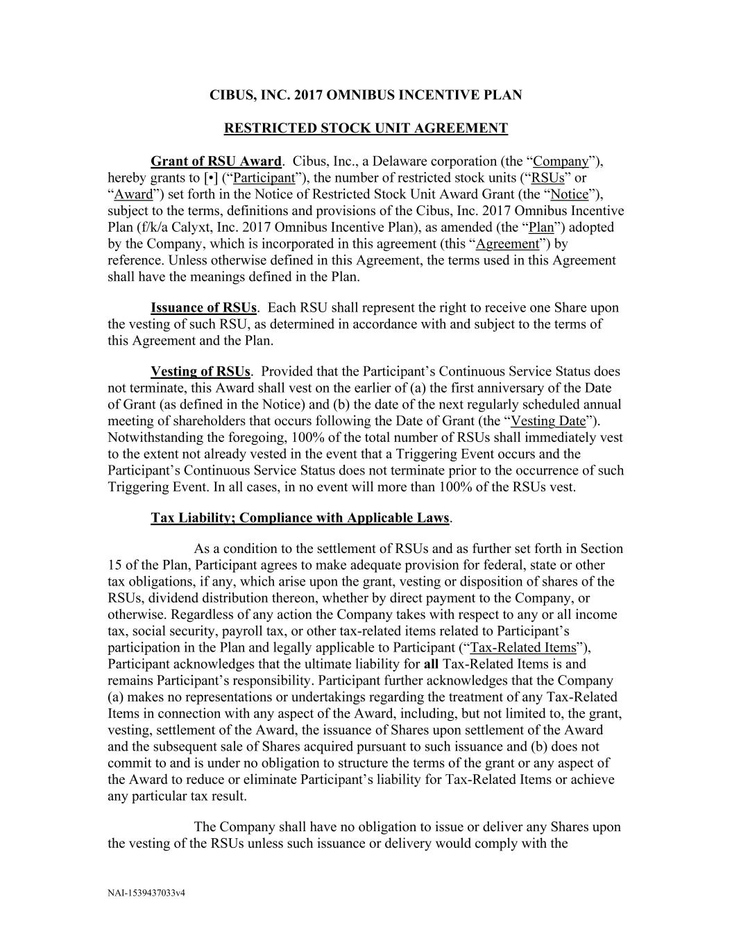 NAI-1539437033v4  CIBUS, INC. 2017 OMNIBUS INCENTIVE PLAN    RESTRICTED STOCK UNIT AGREEMENT    Grant of RSU Award Company Participant RSUs Award Notice subject to the terms, definitions and provisions of the Cibus, Inc. 2017 Omnibus Incentive  Plan Agreement reference. Unless otherwise defined in this Agreement, the terms used in this Agreement  shall have the meanings defined in the Plan.  Issuance of RSUs.  Each RSU shall represent the right to receive one Share upon  the vesting of such RSU, as determined in accordance with and subject to the terms of  this Agreement and the Plan.  Vesting of RSUs not terminate, this Award shall vest on the earlier of (a) the first anniversary of the Date  of Grant (as defined in the Notice) and (b) the date of the next regularly scheduled annual  meeti Vesting Date Notwithstanding the foregoing, 100% of the total number of RSUs shall immediately vest  to the extent not already vested in the event that a Triggering Event occurs and the  Triggering Event. In all cases, in no event will more than 100% of the RSUs vest.  Tax Liability; Compliance with Applicable Laws.    As a condition to the settlement of RSUs and as further set forth in Section  15 of the Plan, Participant agrees to make adequate provision for federal, state or other  tax obligations, if any, which arise upon the grant, vesting or disposition of shares of the  RSUs, dividend distribution thereon, whether by direct payment to the Company, or  otherwise. Regardless of any action the Company takes with respect to any or all income  tax, social security, payroll tax, or other tax-related items related to Participa Tax-Related Items Participant acknowledges that the ultimate liability for all Tax-Related Items is and  acknowledges that the Company  (a) makes no representations or undertakings regarding the treatment of any Tax-Related  Items in connection with any aspect of the Award, including, but not limited to, the grant,  vesting, settlement of the Award, the issuance of Shares upon settlement of the Award  and the subsequent sale of Shares acquired pursuant to such issuance and (b) does not  commit to and is under no obligation to structure the terms of the grant or any aspect of  the Award to reduce or eliminate Partici -Related Items or achieve  any particular tax result.  The Company shall have no obligation to issue or deliver any Shares upon  the vesting of the RSUs unless such issuance or delivery would comply with the