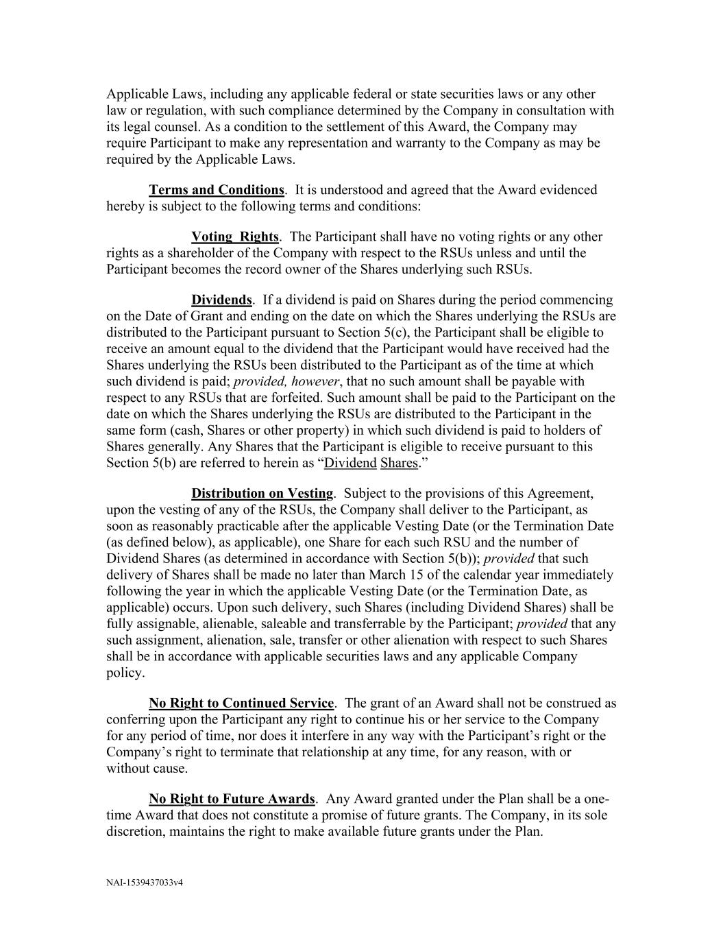 NAI-1539437033v4  Applicable Laws, including any applicable federal or state securities laws or any other  law or regulation, with such compliance determined by the Company in consultation with  its legal counsel. As a condition to the settlement of this Award, the Company may  require Participant to make any representation and warranty to the Company as may be  required by the Applicable Laws.  Terms and Conditions.  It is understood and agreed that the Award evidenced  hereby is subject to the following terms and conditions:  Voting  Rights.  The Participant shall have no voting rights or any other  rights as a shareholder of the Company with respect to the RSUs unless and until the  Participant becomes the record owner of the Shares underlying such RSUs.  Dividends.  If a dividend is paid on Shares during the period commencing  on the Date of Grant and ending on the date on which the Shares underlying the RSUs are  distributed to the Participant pursuant to Section 5(c), the Participant shall be eligible to  receive an amount equal to the dividend that the Participant would have received had the  Shares underlying the RSUs been distributed to the Participant as of the time at which  such dividend is paid; provided, however, that no such amount shall be payable with  respect to any RSUs that are forfeited. Such amount shall be paid to the Participant on the  date on which the Shares underlying the RSUs are distributed to the Participant in the  same form (cash, Shares or other property) in which such dividend is paid to holders of  Shares generally. Any Shares that the Participant is eligible to receive pursuant to this  Dividend Shares   Distribution on Vesting.  Subject to the provisions of this Agreement,  upon the vesting of any of the RSUs, the Company shall deliver to the Participant, as  soon as reasonably practicable after the applicable Vesting Date (or the Termination Date  (as defined below), as applicable), one Share for each such RSU and the number of  Dividend Shares (as determined in accordance with Section 5(b)); provided that such  delivery of Shares shall be made no later than March 15 of the calendar year immediately  following the year in which the applicable Vesting Date (or the Termination Date, as  applicable) occurs. Upon such delivery, such Shares (including Dividend Shares) shall be  fully assignable, alienable, saleable and transferrable by the Participant; provided that any  such assignment, alienation, sale, transfer or other alienation with respect to such Shares  shall be in accordance with applicable securities laws and any applicable Company  policy.  No Right to Continued Service.  The grant of an Award shall not be construed as  conferring upon the Participant any right to continue his or her service to the Company  nate that relationship at any time, for any reason, with or  without cause.  No Right to Future Awards.  Any Award granted under the Plan shall be a one- time Award that does not constitute a promise of future grants. The Company, in its sole  discretion, maintains the right to make available future grants under the Plan.