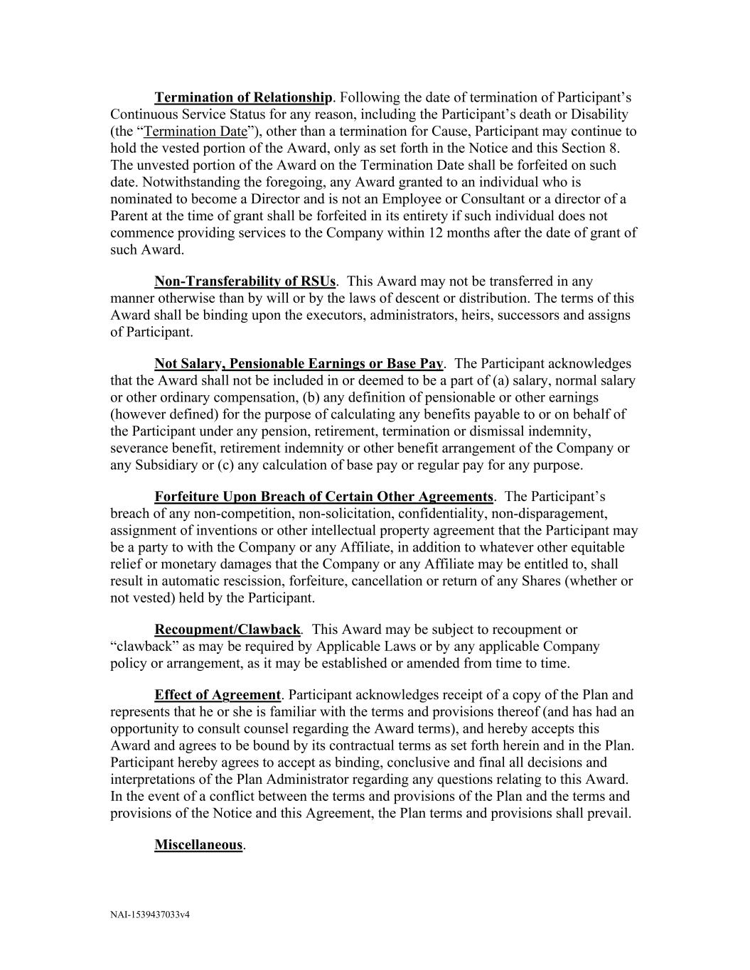 NAI-1539437033v4  Termination of Relationship Termination Date hold the vested portion of the Award, only as set forth in the Notice and this Section 8.  The unvested portion of the Award on the Termination Date shall be forfeited on such  date. Notwithstanding the foregoing, any Award granted to an individual who is  nominated to become a Director and is not an Employee or Consultant or a director of a  Parent at the time of grant shall be forfeited in its entirety if such individual does not  commence providing services to the Company within 12 months after the date of grant of  such Award.  Non-Transferability of RSUs.  This Award may not be transferred in any  manner otherwise than by will or by the laws of descent or distribution. The terms of this  Award shall be binding upon the executors, administrators, heirs, successors and assigns  of Participant.  Not Salary, Pensionable Earnings or Base Pay.  The Participant acknowledges  that the Award shall not be included in or deemed to be a part of (a) salary, normal salary  or other ordinary compensation, (b) any definition of pensionable or other earnings  (however defined) for the purpose of calculating any benefits payable to or on behalf of  the Participant under any pension, retirement, termination or dismissal indemnity,  severance benefit, retirement indemnity or other benefit arrangement of the Company or  any Subsidiary or (c) any calculation of base pay or regular pay for any purpose.  Forfeiture Upon Breach of Certain Other Agreements breach of any non-competition, non-solicitation, confidentiality, non-disparagement,  assignment of inventions or other intellectual property agreement that the Participant may  be a party to with the Company or any Affiliate, in addition to whatever other equitable  relief or monetary damages that the Company or any Affiliate may be entitled to, shall  result in automatic rescission, forfeiture, cancellation or return of any Shares (whether or  not vested) held by the Participant.  Recoupment/Clawback.  This Award may be subject to recoupment or  policy or arrangement, as it may be established or amended from time to time.  Effect of Agreement. Participant acknowledges receipt of a copy of the Plan and  represents that he or she is familiar with the terms and provisions thereof (and has had an  opportunity to consult counsel regarding the Award terms), and hereby accepts this  Award and agrees to be bound by its contractual terms as set forth herein and in the Plan.  Participant hereby agrees to accept as binding, conclusive and final all decisions and  interpretations of the Plan Administrator regarding any questions relating to this Award.  In the event of a conflict between the terms and provisions of the Plan and the terms and  provisions of the Notice and this Agreement, the Plan terms and provisions shall prevail.  Miscellaneous.