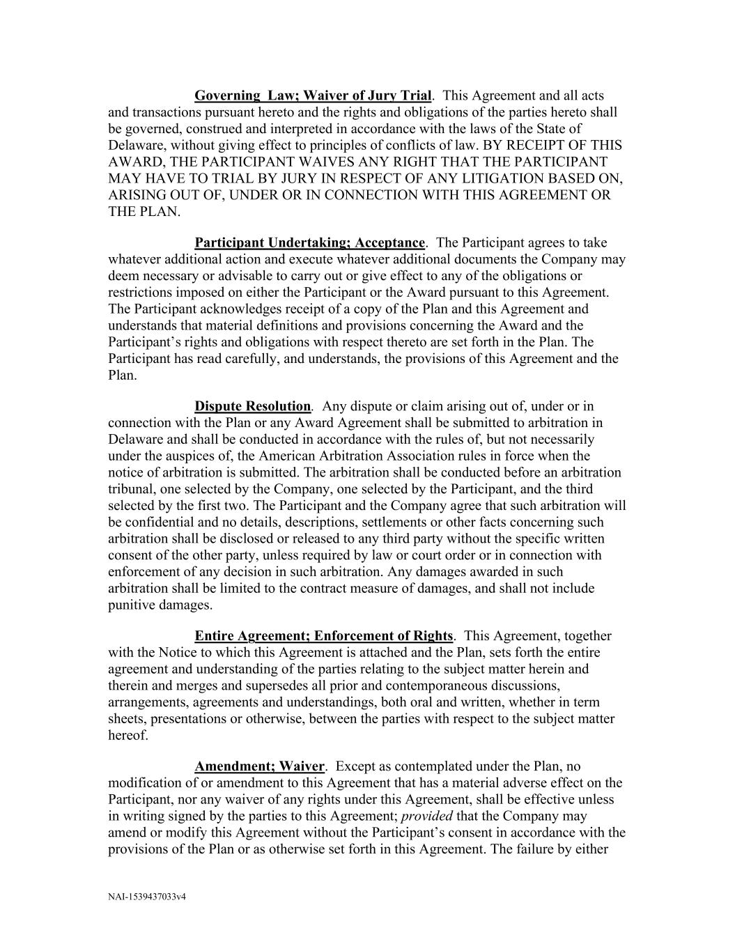 NAI-1539437033v4  Governing  Law; Waiver of Jury Trial.  This Agreement and all acts  and transactions pursuant hereto and the rights and obligations of the parties hereto shall  be governed, construed and interpreted in accordance with the laws of the State of  Delaware, without giving effect to principles of conflicts of law. BY RECEIPT OF THIS  AWARD, THE PARTICIPANT WAIVES ANY RIGHT THAT THE PARTICIPANT  MAY HAVE TO TRIAL BY JURY IN RESPECT OF ANY LITIGATION BASED ON,  ARISING OUT OF, UNDER OR IN CONNECTION WITH THIS AGREEMENT OR  THE PLAN.  Participant Undertaking; Acceptance.  The Participant agrees to take  whatever additional action and execute whatever additional documents the Company may  deem necessary or advisable to carry out or give effect to any of the obligations or  restrictions imposed on either the Participant or the Award pursuant to this Agreement.  The Participant acknowledges receipt of a copy of the Plan and this Agreement and  understands that material definitions and provisions concerning the Award and the  and obligations with respect thereto are set forth in the Plan. The  Participant has read carefully, and understands, the provisions of this Agreement and the  Plan.  Dispute Resolution.  Any dispute or claim arising out of, under or in  connection with the Plan or any Award Agreement shall be submitted to arbitration in  Delaware and shall be conducted in accordance with the rules of, but not necessarily  under the auspices of, the American Arbitration Association rules in force when the  notice of arbitration is submitted. The arbitration shall be conducted before an arbitration  tribunal, one selected by the Company, one selected by the Participant, and the third  selected by the first two. The Participant and the Company agree that such arbitration will  be confidential and no details, descriptions, settlements or other facts concerning such  arbitration shall be disclosed or released to any third party without the specific written  consent of the other party, unless required by law or court order or in connection with  enforcement of any decision in such arbitration. Any damages awarded in such  arbitration shall be limited to the contract measure of damages, and shall not include  punitive damages.  Entire Agreement; Enforcement of Rights.  This Agreement, together  with the Notice to which this Agreement is attached and the Plan, sets forth the entire  agreement and understanding of the parties relating to the subject matter herein and  therein and merges and supersedes all prior and contemporaneous discussions,  arrangements, agreements and understandings, both oral and written, whether in term  sheets, presentations or otherwise, between the parties with respect to the subject matter  hereof.  Amendment; Waiver.  Except as contemplated under the Plan, no  modification of or amendment to this Agreement that has a material adverse effect on the  Participant, nor any waiver of any rights under this Agreement, shall be effective unless  in writing signed by the parties to this Agreement; provided that the Company may  provisions of the Plan or as otherwise set forth in this Agreement. The failure by either