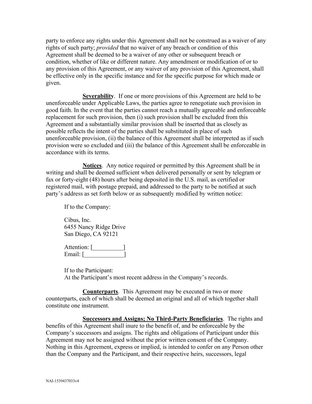 NAI-1539437033v4  party to enforce any rights under this Agreement shall not be construed as a waiver of any  rights of such party; provided that no waiver of any breach or condition of this  Agreement shall be deemed to be a waiver of any other or subsequent breach or  condition, whether of like or different nature. Any amendment or modification of or to  any provision of this Agreement, or any waiver of any provision of this Agreement, shall  be effective only in the specific instance and for the specific purpose for which made or  given.  Severability.  If one or more provisions of this Agreement are held to be  unenforceable under Applicable Laws, the parties agree to renegotiate such provision in  good faith. In the event that the parties cannot reach a mutually agreeable and enforceable  replacement for such provision, then (i) such provision shall be excluded from this  Agreement and a substantially similar provision shall be inserted that as closely as  possible reflects the intent of the parties shall be substituted in place of such  unenforceable provision, (ii) the balance of this Agreement shall be interpreted as if such  provision were so excluded and (iii) the balance of this Agreement shall be enforceable in  accordance with its terms.  Notices.  Any notice required or permitted by this Agreement shall be in  writing and shall be deemed sufficient when delivered personally or sent by telegram or  fax or forty-eight (48) hours after being deposited in the U.S. mail, as certified or  registered mail, with postage prepaid, and addressed to the party to be notified at such    If to the Company:   Cibus, Inc.  6455 Nancy Ridge Drive  San Diego, CA 92121   Attention: [__________]  Email: [_____________]  If to the Participant:    Counterparts.  This Agreement may be executed in two or more  counterparts, each of which shall be deemed an original and all of which together shall  constitute one instrument.  Successors and Assigns; No Third-Party Beneficiaries.  The rights and  benefits of this Agreement shall inure to the benefit of, and be enforceable by the  Agreement may not be assigned without the prior written consent of the Company.  Nothing in this Agreement, express or implied, is intended to confer on any Person other  than the Company and the Participant, and their respective heirs, successors, legal