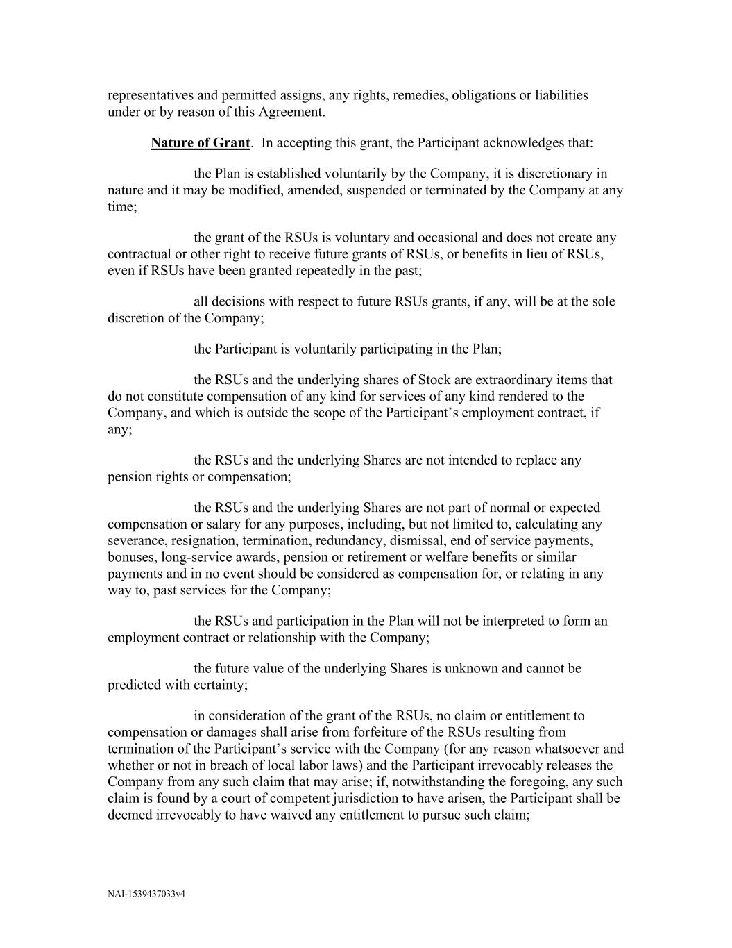NAI-1539437033v4  representatives and permitted assigns, any rights, remedies, obligations or liabilities  under or by reason of this Agreement.  Nature of Grant.  In accepting this grant, the Participant acknowledges that:  the Plan is established voluntarily by the Company, it is discretionary in  nature and it may be modified, amended, suspended or terminated by the Company at any  time;  the grant of the RSUs is voluntary and occasional and does not create any  contractual or other right to receive future grants of RSUs, or benefits in lieu of RSUs,  even if RSUs have been granted repeatedly in the past;  all decisions with respect to future RSUs grants, if any, will be at the sole  discretion of the Company;  the Participant is voluntarily participating in the Plan;  the RSUs and the underlying shares of Stock are extraordinary items that  do not constitute compensation of any kind for services of any kind rendered to the  any;  the RSUs and the underlying Shares are not intended to replace any  pension rights or compensation;  the RSUs and the underlying Shares are not part of normal or expected  compensation or salary for any purposes, including, but not limited to, calculating any  severance, resignation, termination, redundancy, dismissal, end of service payments,  bonuses, long-service awards, pension or retirement or welfare benefits or similar  payments and in no event should be considered as compensation for, or relating in any  way to, past services for the Company;  the RSUs and participation in the Plan will not be interpreted to form an  employment contract or relationship with the Company;  the future value of the underlying Shares is unknown and cannot be  predicted with certainty;  in consideration of the grant of the RSUs, no claim or entitlement to  compensation or damages shall arise from forfeiture of the RSUs resulting from  whether or not in breach of local labor laws) and the Participant irrevocably releases the  Company from any such claim that may arise; if, notwithstanding the foregoing, any such  claim is found by a court of competent jurisdiction to have arisen, the Participant shall be  deemed irrevocably to have waived any entitlement to pursue such claim;