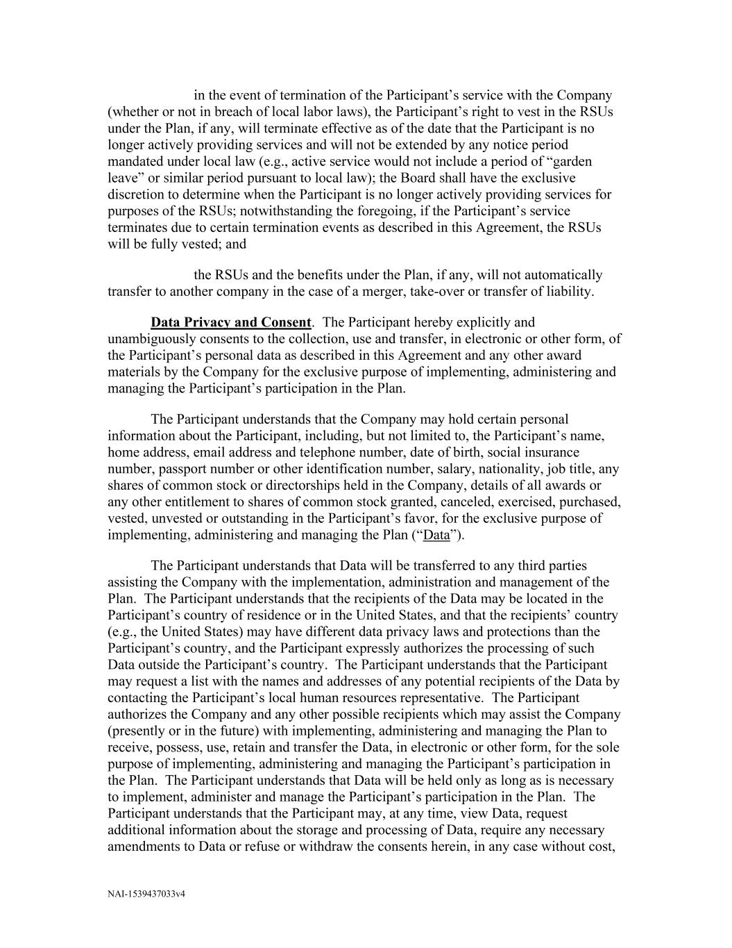 NAI-1539437033v4  under the Plan, if any, will terminate effective as of the date that the Participant is no  longer actively providing services and will not be extended by any notice period  discretion to determine when the Participant is no longer actively providing services for  terminates due to certain termination events as described in this Agreement, the RSUs  will be fully vested; and  the RSUs and the benefits under the Plan, if any, will not automatically  transfer to another company in the case of a merger, take-over or transfer of liability.  Data Privacy and Consent.  The Participant hereby explicitly and  unambiguously consents to the collection, use and transfer, in electronic or other form, of  materials by the Company for the exclusive purpose of implementing, administering and    The Participant understands that the Company may hold certain personal  home address, email address and telephone number, date of birth, social insurance  number, passport number or other identification number, salary, nationality, job title, any  shares of common stock or directorships held in the Company, details of all awards or  any other entitlement to shares of common stock granted, canceled, exercised, purchased,  ve Data   The Participant understands that Data will be transferred to any third parties  assisting the Company with the implementation, administration and management of the  Plan.  The Participant understands that the recipients of the Data may be located in the  Part (e.g., the United States) may have different data privacy laws and protections than the  of such  may request a list with the names and addresses of any potential recipients of the Data by   The Participant  authorizes the Company and any other possible recipients which may assist the Company  (presently or in the future) with implementing, administering and managing the Plan to  receive, possess, use, retain and transfer the Data, in electronic or other form, for the sole  the Plan.  The Participant understands that Data will be held only as long as is necessary  to implement, administer and manage the Participa Participant understands that the Participant may, at any time, view Data, request  additional information about the storage and processing of Data, require any necessary  amendments to Data or refuse or withdraw the consents herein, in any case without cost,