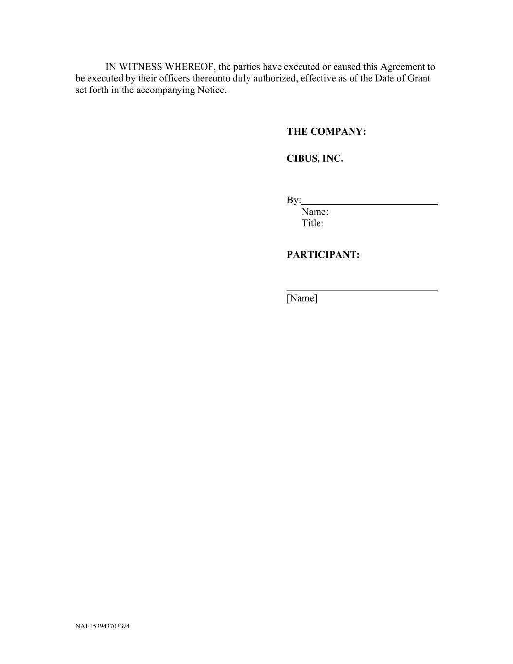 NAI-1539437033v4  IN WITNESS WHEREOF, the parties have executed or caused this Agreement to  be executed by their officers thereunto duly authorized, effective as of the Date of Grant  set forth in the accompanying Notice.  THE COMPANY:   CIBUS, INC.  By:         Name:         Title:  PARTICIPANT:     [Name]