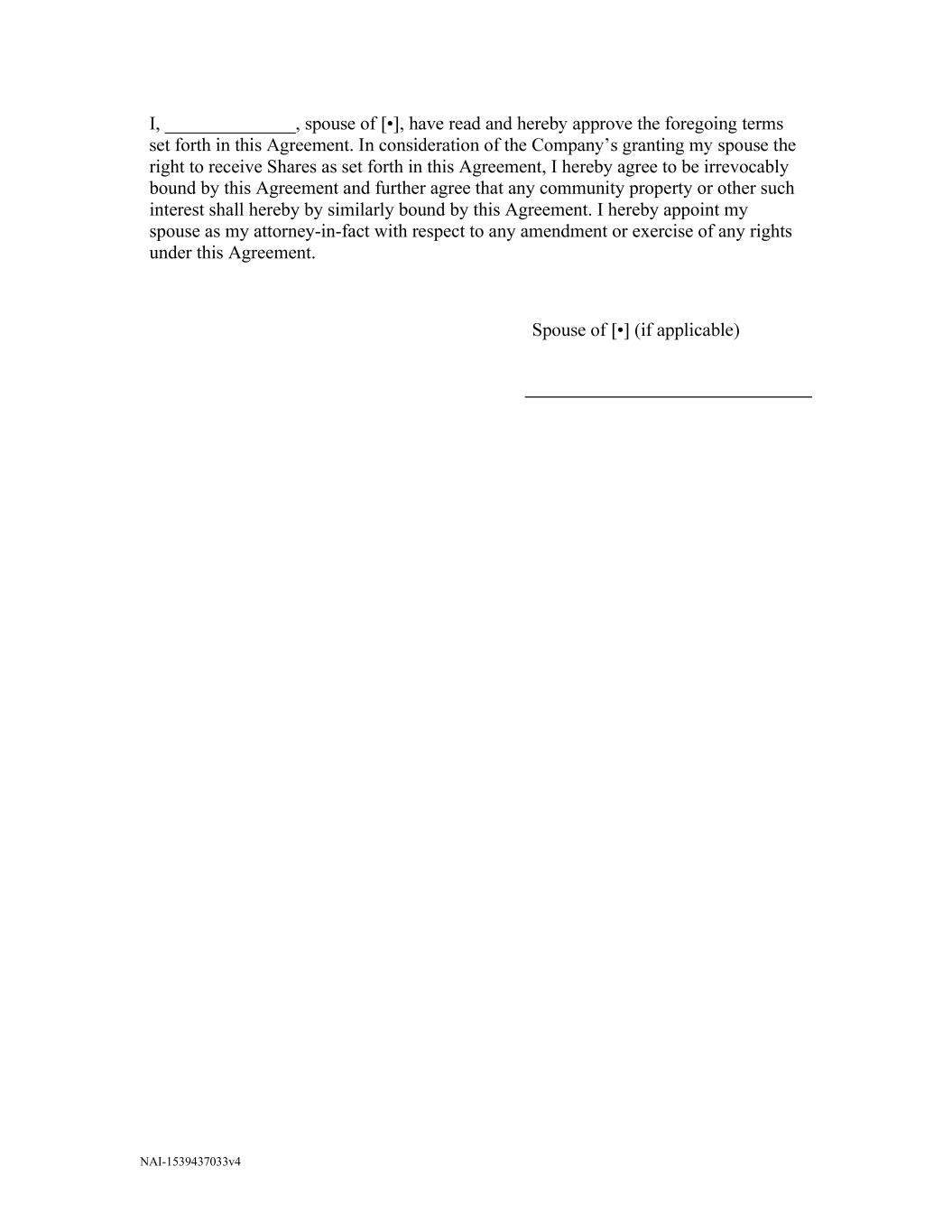 NAI-1539437033v4  I,  right to receive Shares as set forth in this Agreement, I hereby agree to be irrevocably  bound by this Agreement and further agree that any community property or other such  interest shall hereby by similarly bound by this Agreement. I hereby appoint my  spouse as my attorney-in-fact with respect to any amendment or exercise of any rights  under this Agreement.