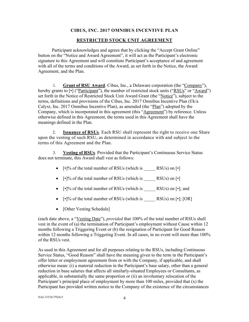 NAI-1537617924v5    4       CIBUS, INC. 2017 OMNIBUS INCENTIVE PLAN  RESTRICTED STOCK UNIT AGREEMENT     Participant acknowledges and agrees that by clicking the “Accept Grant Online”  button on the “Notice and Award Agreement”, it will act as the Participant’s electronic  signature to this Agreement and will constitute Participant’s acceptance of and agreement  with all of the terms and conditions of the Award, as set forth in the Notice, the Award  Agreement, and the Plan.    1. Grant of RSU Award. Cibus, Inc., a Delaware corporation (the “Company”),  hereby grants to [•] (“Participant”), the number of restricted stock units (“RSUs” or “Award”)  set forth in the Notice of Restricted Stock Unit Award Grant (the “Notice”), subject to the  terms, definitions and provisions of the Cibus, Inc. 2017 Omnibus Incentive Plan (f/k/a  Calyxt, Inc. 2017 Omnibus Incentive Plan), as amended (the “Plan”) adopted by the  Company, which is incorporated in this agreement (this “Agreement”) by reference. Unless  otherwise defined in this Agreement, the terms used in this Agreement shall have the  meanings defined in the Plan.  2. Issuance of RSUs. Each RSU shall represent the right to receive one Share  upon the vesting of such RSU, as determined in accordance with and subject to the  terms of this Agreement and the Plan.  3. Vesting of RSUs. Provided that the Participant’s Continuous Service Status  does not terminate, this Award shall vest as follows:   [•]% of the total number of RSUs (which is _____ RSUs) on [•]   [•]% of the total number of RSUs (which is _____ RSUs) on [•]   [•]% of the total number of RSUs (which is _____ RSUs) on [•]; and    [•]% of the total number of RSUs (which is _____ RSUs) on [•]; [OR]   [Other Vesting Schedule]  (each date above, a “Vesting Date”), provided that 100% of the total number of RSUs shall  vest in the event of (a) the termination of Participant’s employment without Cause within 12  months following a Triggering Event or (b) the resignation of Participant for Good Reason  within 12 months following a Triggering Event. In all cases, in no event will more than 100%  of the RSUs vest.  As used in this Agreement and for all purposes relating to the RSUs, including Continuous  Service Status, “Good Reason” shall have the meaning given to the term in the Participant’s  offer letter or employment agreement from or with the Company, if applicable, and shall  otherwise mean: (i) a material reduction in the Participant’s base salary, other than a general  reduction in base salaries that affects all similarly-situated Employees or Consultants, as  applicable, in substantially the same proportion or (ii) an involuntary relocation of the  Participant’s principal place of employment by more than 100 miles, provided that (x) the  Participant has provided written notice to the Company of the existence of the circumstances