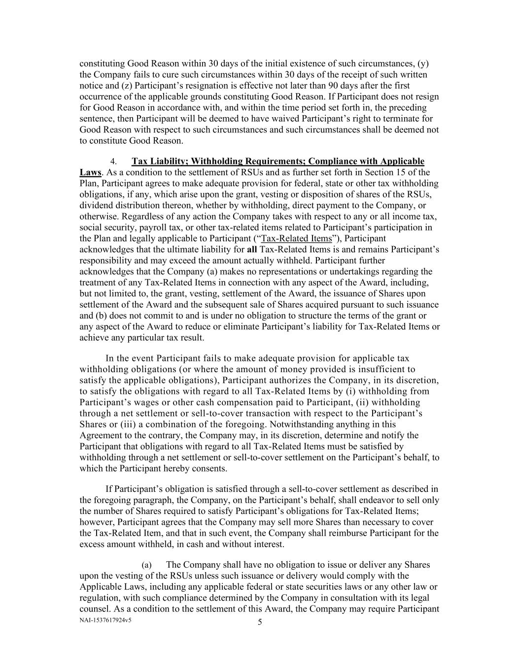 NAI-1537617924v5    5       constituting Good Reason within 30 days of the initial existence of such circumstances, (y)  the Company fails to cure such circumstances within 30 days of the receipt of such written  notice and (z) Participant’s resignation is effective not later than 90 days after the first  occurrence of the applicable grounds constituting Good Reason. If Participant does not resign  for Good Reason in accordance with, and within the time period set forth in, the preceding  sentence, then Participant will be deemed to have waived Participant’s right to terminate for  Good Reason with respect to such circumstances and such circumstances shall be deemed not  to constitute Good Reason.  4. Tax Liability; Withholding Requirements; Compliance with Applicable  Laws. As a condition to the settlement of RSUs and as further set forth in Section 15 of the  Plan, Participant agrees to make adequate provision for federal, state or other tax withholding  obligations, if any, which arise upon the grant, vesting or disposition of shares of the RSUs,  dividend distribution thereon, whether by withholding, direct payment to the Company, or  otherwise. Regardless of any action the Company takes with respect to any or all income tax,  social security, payroll tax, or other tax-related items related to Participant’s participation in  the Plan and legally applicable to Participant (“Tax-Related Items”), Participant  acknowledges that the ultimate liability for all Tax-Related Items is and remains Participant’s  responsibility and may exceed the amount actually withheld. Participant further  acknowledges that the Company (a) makes no representations or undertakings regarding the  treatment of any Tax-Related Items in connection with any aspect of the Award, including,  but not limited to, the grant, vesting, settlement of the Award, the issuance of Shares upon  settlement of the Award and the subsequent sale of Shares acquired pursuant to such issuance  and (b) does not commit to and is under no obligation to structure the terms of the grant or  any aspect of the Award to reduce or eliminate Participant’s liability for Tax-Related Items or  achieve any particular tax result.  In the event Participant fails to make adequate provision for applicable tax  withholding obligations (or where the amount of money provided is insufficient to  satisfy the applicable obligations), Participant authorizes the Company, in its discretion,  to satisfy the obligations with regard to all Tax-Related Items by (i) withholding from  Participant’s wages or other cash compensation paid to Participant, (ii) withholding  through a net settlement or sell-to-cover transaction with respect to the Participant’s  Shares or (iii) a combination of the foregoing. Notwithstanding anything in this  Agreement to the contrary, the Company may, in its discretion, determine and notify the  Participant that obligations with regard to all Tax-Related Items must be satisfied by  withholding through a net settlement or sell-to-cover settlement on the Participant’s behalf, to  which the Participant hereby consents.  If Participant’s obligation is satisfied through a sell-to-cover settlement as described in  the foregoing paragraph, the Company, on the Participant’s behalf, shall endeavor to sell only  the number of Shares required to satisfy Participant’s obligations for Tax-Related Items;  however, Participant agrees that the Company may sell more Shares than necessary to cover  the Tax-Related Item, and that in such event, the Company shall reimburse Participant for the  excess amount withheld, in cash and without interest.  (a) The Company shall have no obligation to issue or deliver any Shares  upon the vesting of the RSUs unless such issuance or delivery would comply with the  Applicable Laws, including any applicable federal or state securities laws or any other law or  regulation, with such compliance determined by the Company in consultation with its legal  counsel. As a condition to the settlement of this Award, the Company may require Participant