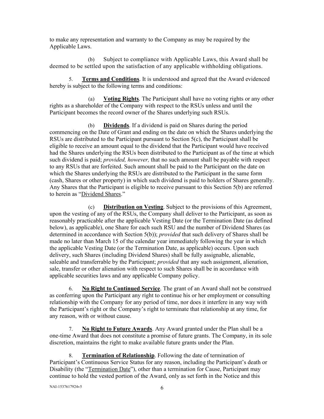 NAI-1537617924v5    6       to make any representation and warranty to the Company as may be required by the  Applicable Laws.  (b) Subject to compliance with Applicable Laws, this Award shall be  deemed to be settled upon the satisfaction of any applicable withholding obligations.  5. Terms and Conditions. It is understood and agreed that the Award evidenced  hereby is subject to the following terms and conditions:  (a) Voting Rights. The Participant shall have no voting rights or any other  rights as a shareholder of the Company with respect to the RSUs unless and until the  Participant becomes the record owner of the Shares underlying such RSUs.  (b) Dividends. If a dividend is paid on Shares during the period  commencing on the Date of Grant and ending on the date on which the Shares underlying the  RSUs are distributed to the Participant pursuant to Section 5(c), the Participant shall be  eligible to receive an amount equal to the dividend that the Participant would have received  had the Shares underlying the RSUs been distributed to the Participant as of the time at which  such dividend is paid; provided, however, that no such amount shall be payable with respect  to any RSUs that are forfeited. Such amount shall be paid to the Participant on the date on  which the Shares underlying the RSUs are distributed to the Participant in the same form  (cash, Shares or other property) in which such dividend is paid to holders of Shares generally.  Any Shares that the Participant is eligible to receive pursuant to this Section 5(b) are referred  to herein as “Dividend Shares.”  (c) Distribution on Vesting. Subject to the provisions of this Agreement,  upon the vesting of any of the RSUs, the Company shall deliver to the Participant, as soon as  reasonably practicable after the applicable Vesting Date (or the Termination Date (as defined  below), as applicable), one Share for each such RSU and the number of Dividend Shares (as  determined in accordance with Section 5(b)); provided that such delivery of Shares shall be  made no later than March 15 of the calendar year immediately following the year in which  the applicable Vesting Date (or the Termination Date, as applicable) occurs. Upon such  delivery, such Shares (including Dividend Shares) shall be fully assignable, alienable,  saleable and transferrable by the Participant; provided that any such assignment, alienation,  sale, transfer or other alienation with respect to such Shares shall be in accordance with  applicable securities laws and any applicable Company policy.   6. No Right to Continued Service. The grant of an Award shall not be construed  as conferring upon the Participant any right to continue his or her employment or consulting  relationship with the Company for any period of time, nor does it interfere in any way with  the Participant’s right or the Company’s right to terminate that relationship at any time, for  any reason, with or without cause.  7. No Right to Future Awards. Any Award granted under the Plan shall be a  one-time Award that does not constitute a promise of future grants. The Company, in its sole  discretion, maintains the right to make available future grants under the Plan.  8. Termination of Relationship. Following the date of termination of  Participant’s Continuous Service Status for any reason, including the Participant’s death or  Disability (the “Termination Date”), other than a termination for Cause, Participant may  continue to hold the vested portion of the Award, only as set forth in the Notice and this
