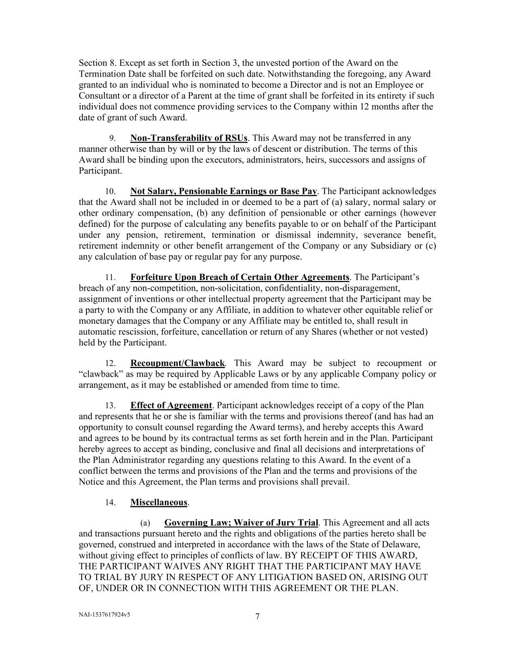 NAI-1537617924v5    7       Section 8. Except as set forth in Section 3, the unvested portion of the Award on the  Termination Date shall be forfeited on such date. Notwithstanding the foregoing, any Award  granted to an individual who is nominated to become a Director and is not an Employee or  Consultant or a director of a Parent at the time of grant shall be forfeited in its entirety if such  individual does not commence providing services to the Company within 12 months after the  date of grant of such Award.  9. Non-Transferability of RSUs. This Award may not be transferred in any  manner otherwise than by will or by the laws of descent or distribution. The terms of this  Award shall be binding upon the executors, administrators, heirs, successors and assigns of  Participant.  10. Not Salary, Pensionable Earnings or Base Pay. The Participant acknowledges  that the Award shall not be included in or deemed to be a part of (a) salary, normal salary or  other ordinary compensation, (b) any definition of pensionable or other earnings (however  defined) for the purpose of calculating any benefits payable to or on behalf of the Participant  under any pension, retirement, termination or dismissal indemnity, severance benefit,  retirement indemnity or other benefit arrangement of the Company or any Subsidiary or (c)  any calculation of base pay or regular pay for any purpose.  11. Forfeiture Upon Breach of Certain Other Agreements. The Participant’s  breach of any non-competition, non-solicitation, confidentiality, non-disparagement,  assignment of inventions or other intellectual property agreement that the Participant may be  a party to with the Company or any Affiliate, in addition to whatever other equitable relief or  monetary damages that the Company or any Affiliate may be entitled to, shall result in  automatic rescission, forfeiture, cancellation or return of any Shares (whether or not vested)  held by the Participant.  12. Recoupment/Clawback. This Award may be subject to recoupment or  “clawback” as may be required by Applicable Laws or by any applicable Company policy or  arrangement, as it may be established or amended from time to time.   13. Effect of Agreement. Participant acknowledges receipt of a copy of the Plan  and represents that he or she is familiar with the terms and provisions thereof (and has had an  opportunity to consult counsel regarding the Award terms), and hereby accepts this Award  and agrees to be bound by its contractual terms as set forth herein and in the Plan. Participant  hereby agrees to accept as binding, conclusive and final all decisions and interpretations of  the Plan Administrator regarding any questions relating to this Award. In the event of a  conflict between the terms and provisions of the Plan and the terms and provisions of the  Notice and this Agreement, the Plan terms and provisions shall prevail.  14. Miscellaneous.   (a) Governing Law; Waiver of Jury Trial. This Agreement and all acts  and transactions pursuant hereto and the rights and obligations of the parties hereto shall be  governed, construed and interpreted in accordance with the laws of the State of Delaware,  without giving effect to principles of conflicts of law. BY RECEIPT OF THIS AWARD,  THE PARTICIPANT WAIVES ANY RIGHT THAT THE PARTICIPANT MAY HAVE  TO TRIAL BY JURY IN RESPECT OF ANY LITIGATION BASED ON, ARISING OUT  OF, UNDER OR IN CONNECTION WITH THIS AGREEMENT OR THE PLAN.