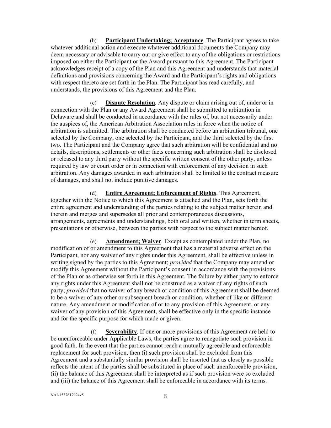 NAI-1537617924v5    8       (b) Participant Undertaking; Acceptance. The Participant agrees to take  whatever additional action and execute whatever additional documents the Company may  deem necessary or advisable to carry out or give effect to any of the obligations or restrictions  imposed on either the Participant or the Award pursuant to this Agreement. The Participant  acknowledges receipt of a copy of the Plan and this Agreement and understands that material  definitions and provisions concerning the Award and the Participant’s rights and obligations  with respect thereto are set forth in the Plan. The Participant has read carefully, and  understands, the provisions of this Agreement and the Plan.  (c) Dispute Resolution. Any dispute or claim arising out of, under or in  connection with the Plan or any Award Agreement shall be submitted to arbitration in  Delaware and shall be conducted in accordance with the rules of, but not necessarily under  the auspices of, the American Arbitration Association rules in force when the notice of  arbitration is submitted. The arbitration shall be conducted before an arbitration tribunal, one  selected by the Company, one selected by the Participant, and the third selected by the first  two. The Participant and the Company agree that such arbitration will be confidential and no  details, descriptions, settlements or other facts concerning such arbitration shall be disclosed  or released to any third party without the specific written consent of the other party, unless  required by law or court order or in connection with enforcement of any decision in such  arbitration. Any damages awarded in such arbitration shall be limited to the contract measure  of damages, and shall not include punitive damages.  (d) Entire Agreement; Enforcement of Rights. This Agreement,  together with the Notice to which this Agreement is attached and the Plan, sets forth the  entire agreement and understanding of the parties relating to the subject matter herein and  therein and merges and supersedes all prior and contemporaneous discussions,  arrangements, agreements and understandings, both oral and written, whether in term sheets,  presentations or otherwise, between the parties with respect to the subject matter hereof.   (e) Amendment; Waiver. Except as contemplated under the Plan, no  modification of or amendment to this Agreement that has a material adverse effect on the  Participant, nor any waiver of any rights under this Agreement, shall be effective unless in  writing signed by the parties to this Agreement; provided that the Company may amend or  modify this Agreement without the Participant’s consent in accordance with the provisions  of the Plan or as otherwise set forth in this Agreement. The failure by either party to enforce  any rights under this Agreement shall not be construed as a waiver of any rights of such  party; provided that no waiver of any breach or condition of this Agreement shall be deemed  to be a waiver of any other or subsequent breach or condition, whether of like or different  nature. Any amendment or modification of or to any provision of this Agreement, or any  waiver of any provision of this Agreement, shall be effective only in the specific instance  and for the specific purpose for which made or given.  (f) Severability. If one or more provisions of this Agreement are held to  be unenforceable under Applicable Laws, the parties agree to renegotiate such provision in  good faith. In the event that the parties cannot reach a mutually agreeable and enforceable  replacement for such provision, then (i) such provision shall be excluded from this  Agreement and a substantially similar provision shall be inserted that as closely as possible  reflects the intent of the parties shall be substituted in place of such unenforceable provision,  (ii) the balance of this Agreement shall be interpreted as if such provision were so excluded  and (iii) the balance of this Agreement shall be enforceable in accordance with its terms.