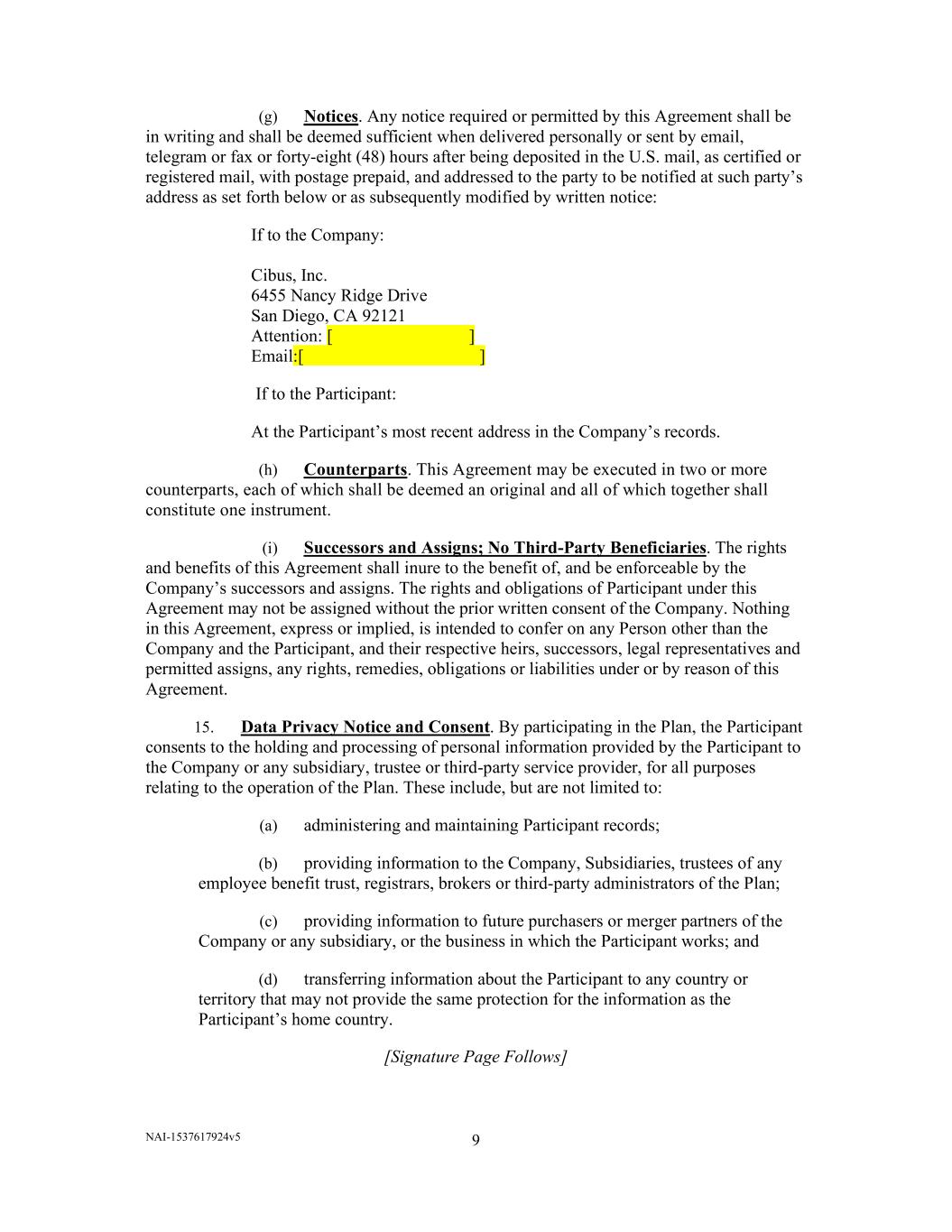 NAI-1537617924v5    9       (g) Notices. Any notice required or permitted by this Agreement shall be  in writing and shall be deemed sufficient when delivered personally or sent by email,  telegram or fax or forty-eight (48) hours after being deposited in the U.S. mail, as certified or  registered mail, with postage prepaid, and addressed to the party to be notified at such party’s  address as set forth below or as subsequently modified by written notice:   If to the Company:    Cibus, Inc.  6455 Nancy Ridge Drive  San Diego, CA 92121  Attention: [                               ]  Email:[                                        ]   If to the Participant:   At the Participant’s most recent address in the Company’s records.  (h) Counterparts. This Agreement may be executed in two or more  counterparts, each of which shall be deemed an original and all of which together shall  constitute one instrument.  (i) Successors and Assigns; No Third-Party Beneficiaries. The rights  and benefits of this Agreement shall inure to the benefit of, and be enforceable by the  Company’s successors and assigns. The rights and obligations of Participant under this  Agreement may not be assigned without the prior written consent of the Company. Nothing  in this Agreement, express or implied, is intended to confer on any Person other than the  Company and the Participant, and their respective heirs, successors, legal representatives and  permitted assigns, any rights, remedies, obligations or liabilities under or by reason of this  Agreement.  15. Data Privacy Notice and Consent. By participating in the Plan, the Participant  consents to the holding and processing of personal information provided by the Participant to  the Company or any subsidiary, trustee or third-party service provider, for all purposes  relating to the operation of the Plan. These include, but are not limited to:  (a) administering and maintaining Participant records;  (b) providing information to the Company, Subsidiaries, trustees of any  employee benefit trust, registrars, brokers or third-party administrators of the Plan;  (c) providing information to future purchasers or merger partners of the  Company or any subsidiary, or the business in which the Participant works; and  (d) transferring information about the Participant to any country or  territory that may not provide the same protection for the information as the  Participant’s home country.  [Signature Page Follows]