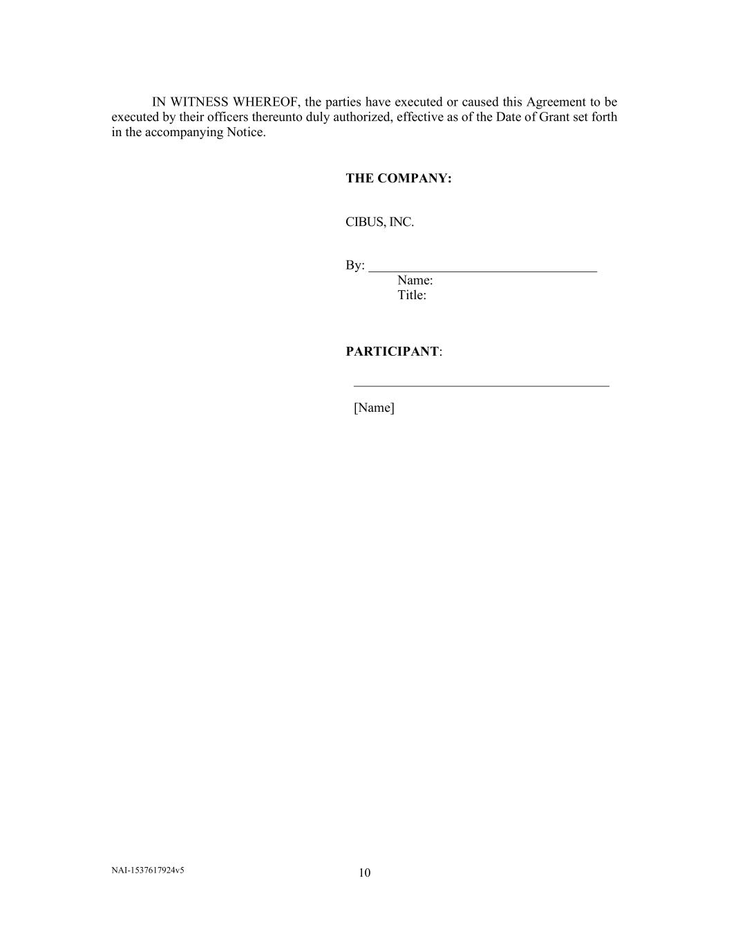 NAI-1537617924v5    10       IN WITNESS WHEREOF, the parties have executed or caused this Agreement to be  executed by their officers thereunto duly authorized, effective as of the Date of Grant set forth  in the accompanying Notice.       THE COMPANY:    CIBUS, INC.    By: __________________________________   Name:             Title:     PARTICIPANT:   ______________________________________  [Name]