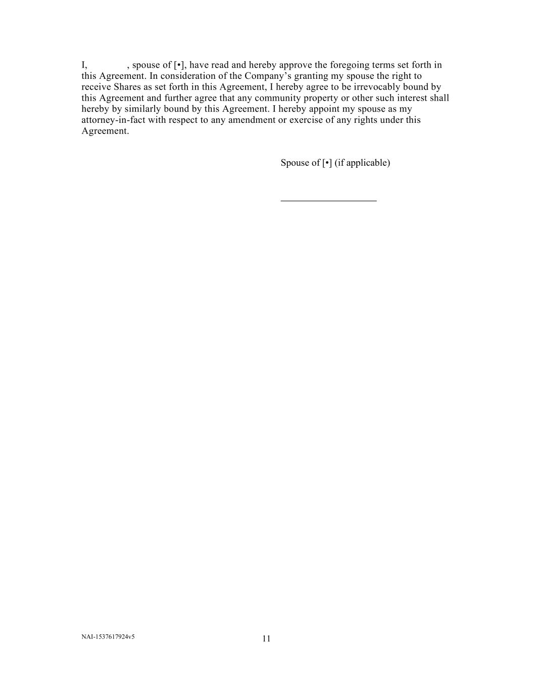 NAI-1537617924v5    11       I,               , spouse of [•], have read and hereby approve the foregoing terms set forth in  this Agreement. In consideration of the Company’s granting my spouse the right to  receive Shares as set forth in this Agreement, I hereby agree to be irrevocably bound by  this Agreement and further agree that any community property or other such interest shall  hereby by similarly bound by this Agreement. I hereby appoint my spouse as my  attorney-in-fact with respect to any amendment or exercise of any rights under this  Agreement.    Spouse of [•] (if applicable)