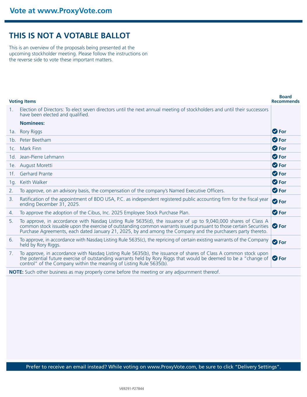 Vote at www.ProxyVote.com Prefer to receive an email instead? While voting on www.ProxyVote.com, be sure to click “Delivery Settings”. Voting Items Board Recommends V69291-P27844 THIS IS NOT A VOTABLE BALLOT This is an overview of the proposals being presented at the upcoming stockholder meeting. Please follow the instructions on the reverse side to vote these important matters. 1. Election of Directors: To elect seven directors until the next annual meeting of stockholders and until their successors have been elected and qualified. Nominees: 1a. Rory Riggs For 1b. Peter Beetham For 1c. Mark Finn For 1d. Jean-Pierre Lehmann For 1e. August Moretti For 1f. Gerhard Prante For 1g. Keith Walker For 2. To approve, on an advisory basis, the compensation of the company’s Named Executive Officers. For 3. Ratification of the appointment of BDO USA, P.C. as independent registered public accounting firm for the fiscal year ending December 31, 2025. For 4. To approve the adoption of the Cibus, Inc. 2025 Employee Stock Purchase Plan. For 5. To approve, in accordance with Nasdaq Listing Rule 5635(d), the issuance of up to 9,040,000 shares of Class A common stock issuable upon the exercise of outstanding common warrants issued pursuant to those certain Securities Purchase Agreements, each dated January 21, 2025, by and among the Company and the purchasers party thereto. For 6. To approve, in accordance with Nasdaq Listing Rule 5635(c), the repricing of certain existing warrants of the Company held by Rory Riggs. For 7. To approve, in accordance with Nasdaq Listing Rule 5635(b), the issuance of shares of Class A common stock upon the potential future exercise of outstanding warrants held by Rory Riggs that would be deemed to be a “change of control” of the Company within the meaning of Listing Rule 5635(b). For NOTE: Such other business as may properly come before the meeting or any adjournment thereof.