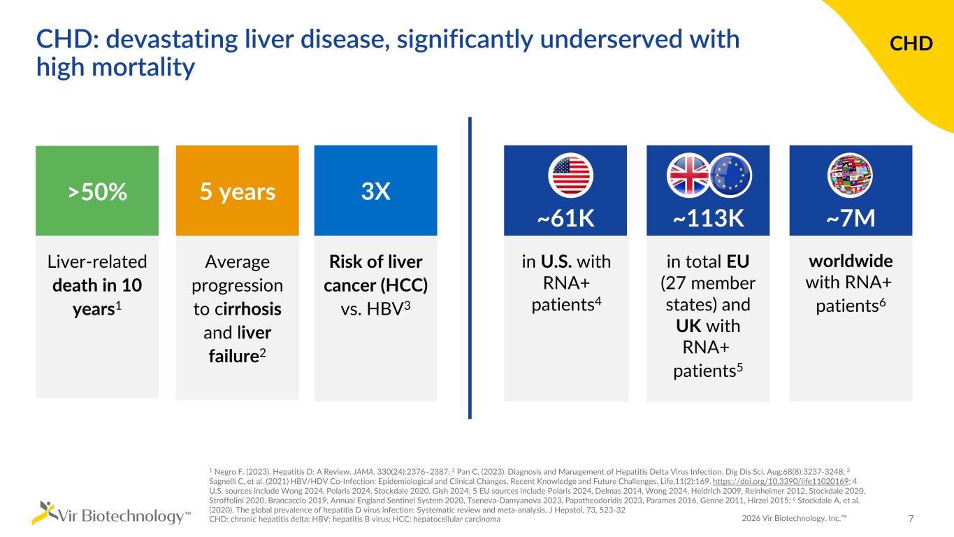 Our path to delivering transformational therapies to people living with devastating diseases: Chronic Hepatitis Delta (CHD) Commercializing our chronic hepatitis delta (CHD) combination therapy will drive near-term revenue sustainability Accelerating our masked T-cell engager (TCE) immunotherapy portfolio offers key value inflection points Aiming Vir Bio's discovery engine at developing a robust pipeline of cancer immunotherapies creates sustainable long-term growth 2026 Vir Biotechnology, Inc. 6 Financial Highlights ~$781M cash and investments1 with cash runway into Q4 2027 Strategic Collaborations Selectively partner drug candidates to focus internal resources, unlock the value of our pipeline and maximize benefit to patients 1 We estimate our cash, cash equivalents, and investments to be approximately $781 million as of December 31, 2025. This is a preliminary, estimated, and unaudited financial result. Actual results may differ from this estimate.