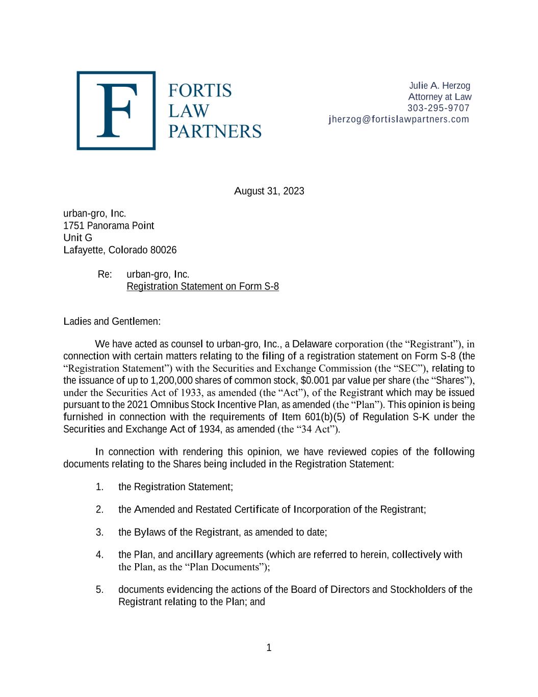 1 Julie A. Herzog Attorney at Law 303-295-9707 jherzog@fortislawpartners.com August 31, 2023 urban-gro, Inc. 1751 Panorama Point Unit G Lafayette, Colorado 80026 Re: urban-gro, Inc. Registration Statement on Form S-8 Ladies and Gentlemen: We have acted as counsel to urban-gro, Inc., a Delaware corporation (the “Registrant”), in connection with certain matters relating to the filing of a registration statement on Form S-8 (the “Registration Statement”) with the Securities and Exchange Commission (the “SEC”), relating to the issuance of up to 1,200,000 shares of common stock, $0.001 par value per share (the “Shares”), under the Securities Act of 1933, as amended (the “Act”), of the Registrant which may be issued pursuant to the 2021 Omnibus Stock Incentive Plan, as amended (the “Plan”). This opinion is being furnished in connection with the requirements of Item 601(b)(5) of Regulation S-K under the Securities and Exchange Act of 1934, as amended (the “34 Act”). In connection with rendering this opinion, we have reviewed copies of the following documents relating to the Shares being included in the Registration Statement: 1. the Registration Statement; 2. the Amended and Restated Certificate of Incorporation of the Registrant; 3. the Bylaws of the Registrant, as amended to date; 4. the Plan, and ancillary agreements (which are referred to herein, collectively with the Plan, as the “Plan Documents”); 5. documents evidencing the actions of the Board of Directors and Stockholders of the Registrant relating to the Plan; and