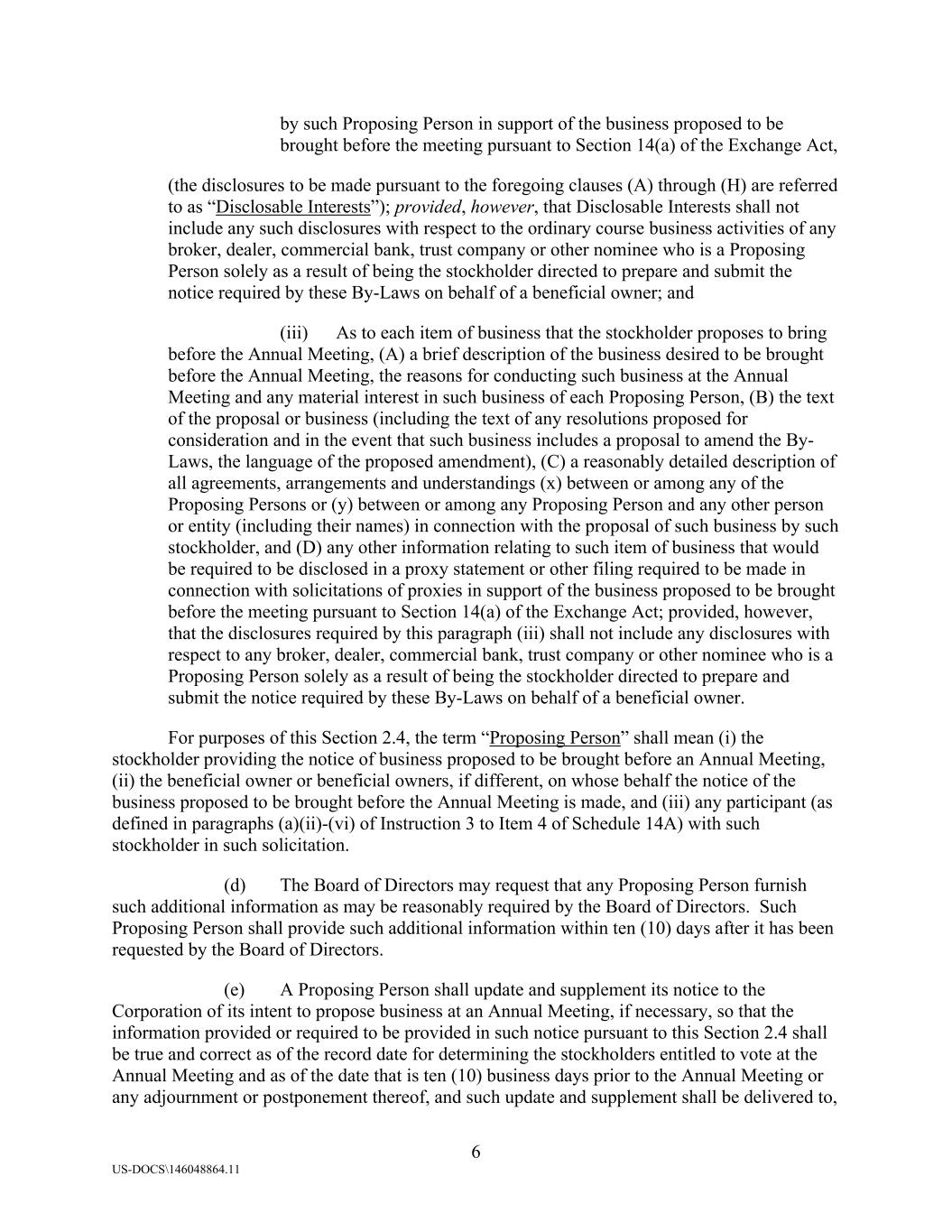6 US-DOCS\146048864.11 by such Proposing Person in support of the business proposed to be brought before the meeting pursuant to Section 14(a) of the Exchange Act, (the disclosures to be made pursuant to the foregoing clauses (A) through (H) are referred to as “Disclosable Interests”); provided, however, that Disclosable Interests shall not include any such disclosures with respect to the ordinary course business activities of any broker, dealer, commercial bank, trust company or other nominee who is a Proposing Person solely as a result of being the stockholder directed to prepare and submit the notice required by these By-Laws on behalf of a beneficial owner; and (iii) As to each item of business that the stockholder proposes to bring before the Annual Meeting, (A) a brief description of the business desired to be brought before the Annual Meeting, the reasons for conducting such business at the Annual Meeting and any material interest in such business of each Proposing Person, (B) the text of the proposal or business (including the text of any resolutions proposed for consideration and in the event that such business includes a proposal to amend the By- Laws, the language of the proposed amendment), (C) a reasonably detailed description of all agreements, arrangements and understandings (x) between or among any of the Proposing Persons or (y) between or among any Proposing Person and any other person or entity (including their names) in connection with the proposal of such business by such stockholder, and (D) any other information relating to such item of business that would be required to be disclosed in a proxy statement or other filing required to be made in connection with solicitations of proxies in support of the business proposed to be brought before the meeting pursuant to Section 14(a) of the Exchange Act; provided, however, that the disclosures required by this paragraph (iii) shall not include any disclosures with respect to any broker, dealer, commercial bank, trust company or other nominee who is a Proposing Person solely as a result of being the stockholder directed to prepare and submit the notice required by these By-Laws on behalf of a beneficial owner. For purposes of this Section 2.4, the term “Proposing Person” shall mean (i) the stockholder providing the notice of business proposed to be brought before an Annual Meeting, (ii) the beneficial owner or beneficial owners, if different, on whose behalf the notice of the business proposed to be brought before the Annual Meeting is made, and (iii) any participant (as defined in paragraphs (a)(ii)-(vi) of Instruction 3 to Item 4 of Schedule 14A) with such stockholder in such solicitation. (d) The Board of Directors may request that any Proposing Person furnish such additional information as may be reasonably required by the Board of Directors. Such Proposing Person shall provide such additional information within ten (10) days after it has been requested by the Board of Directors. (e) A Proposing Person shall update and supplement its notice to the Corporation of its intent to propose business at an Annual Meeting, if necessary, so that the information provided or required to be provided in such notice pursuant to this Section 2.4 shall be true and correct as of the record date for determining the stockholders entitled to vote at the Annual Meeting and as of the date that is ten (10) business days prior to the Annual Meeting or any adjournment or postponement thereof, and such update and supplement shall be delivered to,