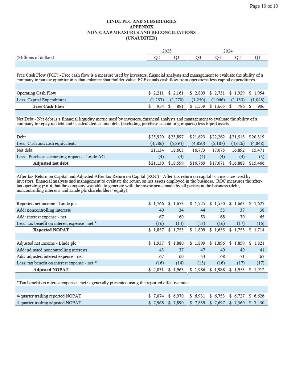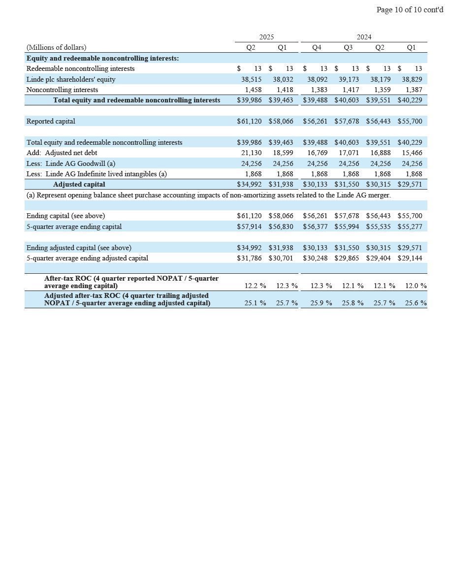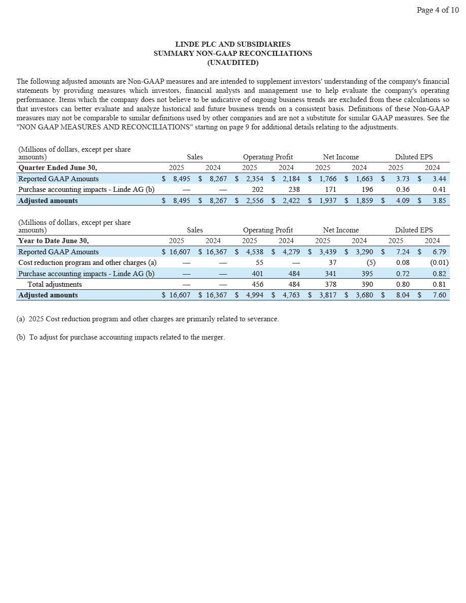 Woking, UK, August 1, 2025 – Linde plc (Nasdaq: LIN) today reported second-quarter 2025 net income of $1,766 million and diluted earnings per share of $3.73, up 6% and up 8%, respectively. Excluding Linde AG purchase accounting impacts, adjusted net income was $1,937 million, up 4% versus prior year. Adjusted earnings per share was $4.09, 6% above prior year.