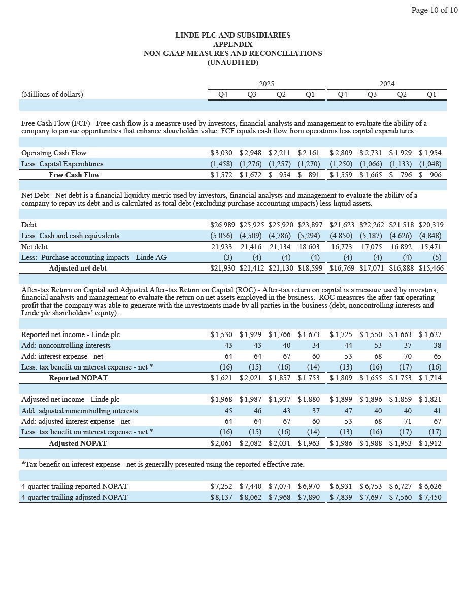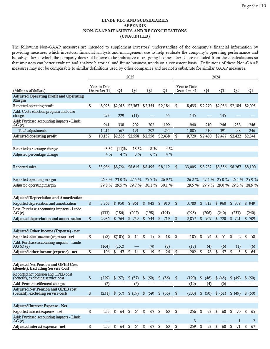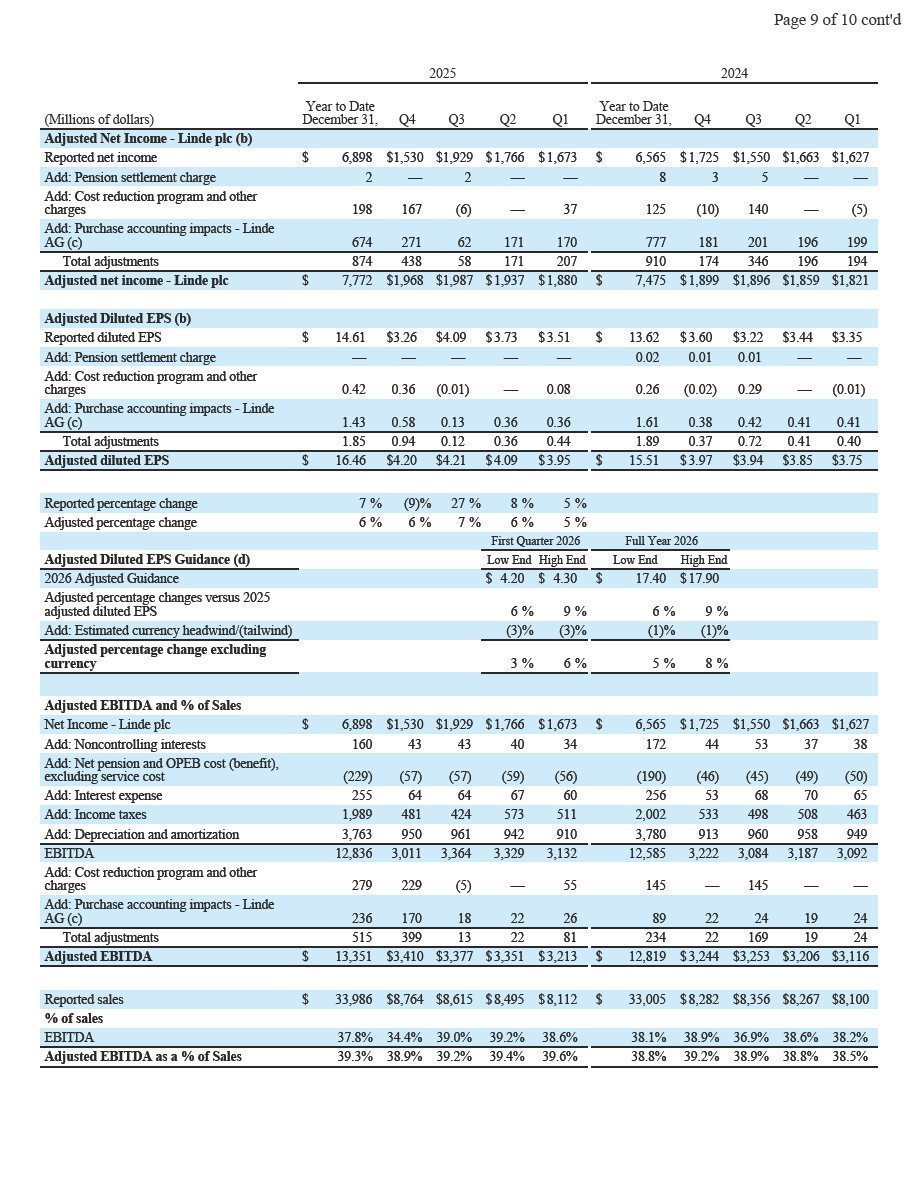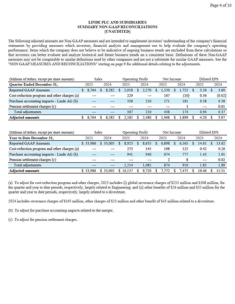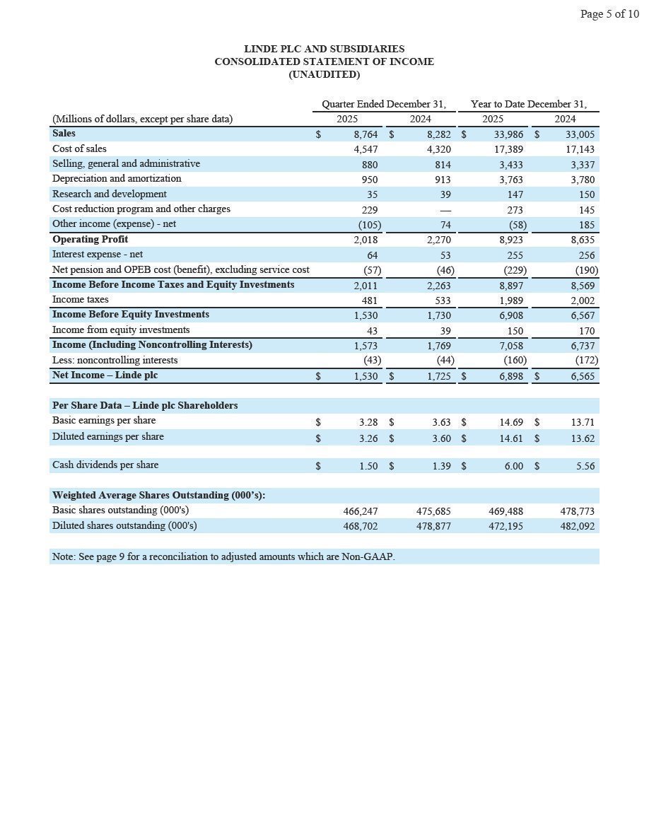 Woking, UK, February 5, 2026 – Linde plc (Nasdaq: LIN) today reported fourth-quarter 2025 net income of $1,530 million and diluted earnings per share of $3.26, down 11% and 9%, respectively. Excluding Linde AG purchase accounting impacts and restructuring charge impacts, adjusted net income was $1,968 million, up 4% versus prior year. Adjusted earnings per share was $4.20, 6% above prior year.