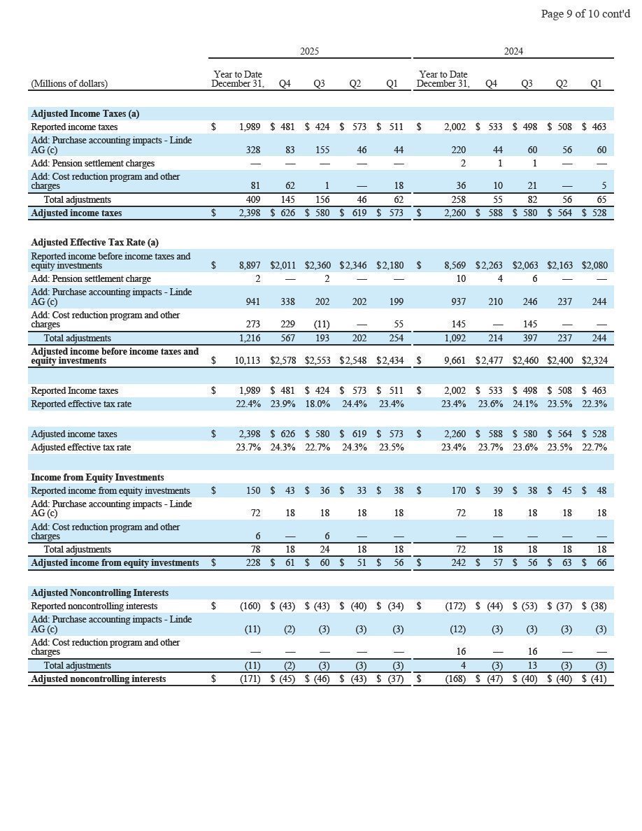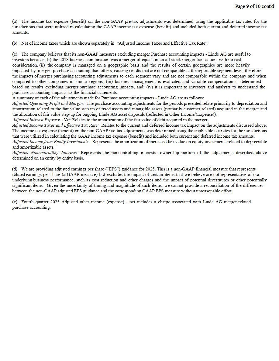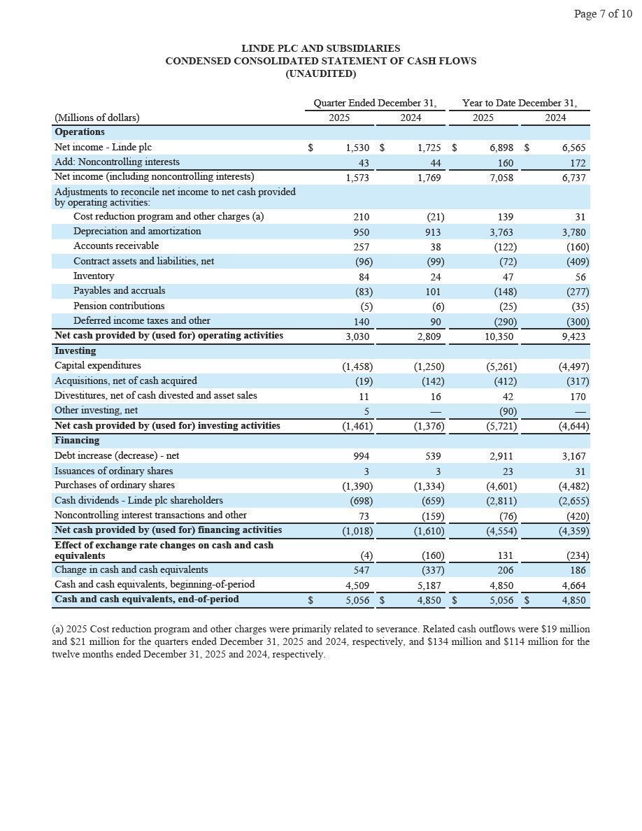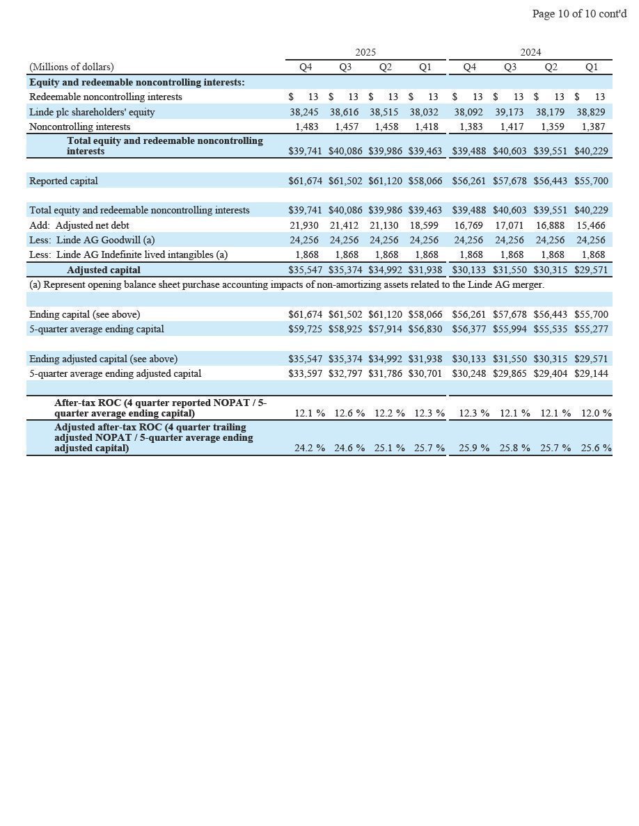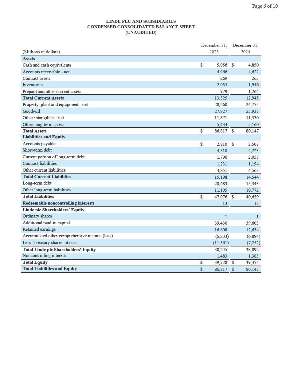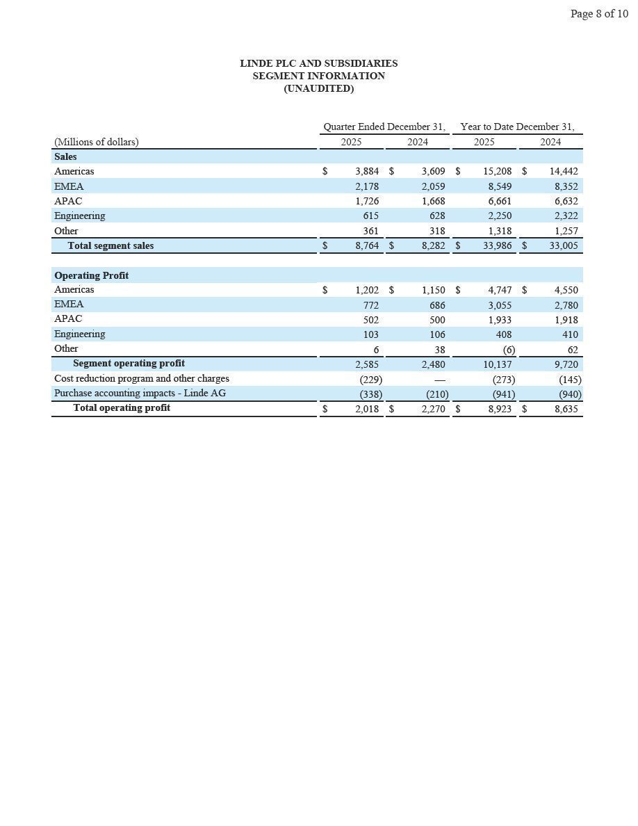Woking, UK, February 5, 2026 – Linde plc (Nasdaq: LIN) today reported fourth-quarter 2025 net income of $1,530 million and diluted earnings per share of $3.26, down 11% and 9%, respectively. Excluding Linde AG purchase accounting impacts and restructuring charge impacts, adjusted net income was $1,968 million, up 4% versus prior year. Adjusted earnings per share was $4.20, 6% above prior year.