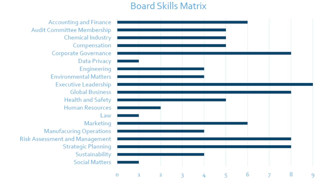 ![]() | | | DAVID A. BRADLEY Age: 53 Independent Director | | | David A. Bradley has served on our Board since April 2022. Since March 2019, Mr. Bradley has served as the President and Chief Executive Officer and member of the board of directors of SI Group. Prior to joining SI Group, Mr. Bradley served as President and CEO and member of the board of directors of Nexeo Solutions between 2011 and 2019. Prior to that, Mr. Bradley spent seven years at Kraton Corporation, where he held several executive positions, including Chief Operating Officer, Vice President of Global Operations, and Vice President of Business Transformation. Since 2019, he also has been a member of the board of directors of South Texas Truck Centers LLP. Because of his extensive experience in the chemicals sector and his extensive management and leadership experience, we believe Mr. Bradley is well qualified to serve on our Board. |