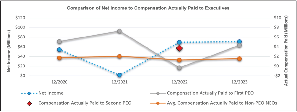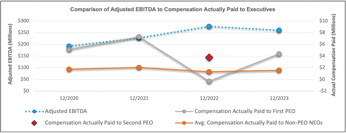 | | Year | | | Summary Compensation Table Total for First PEO(1) | | | Summary Compensation Table Total for Second PEO(1) | | | Compensation Actually Paid to First PEO(1)(2) | | | Compensation Actually Paid to Second PEO(1)(2) | | | Average Summary Compensation Table Total for Non-PEO NEOs(3) | | | Average Compensation Actually Paid to Non-PEO NEOs(2)(3) | | | Value of Initial Fixed $100 Investment Based On:(4) | | | Net Income ($ Thousands) | | | Adjusted EBITDA ($ Thousands) | | |||